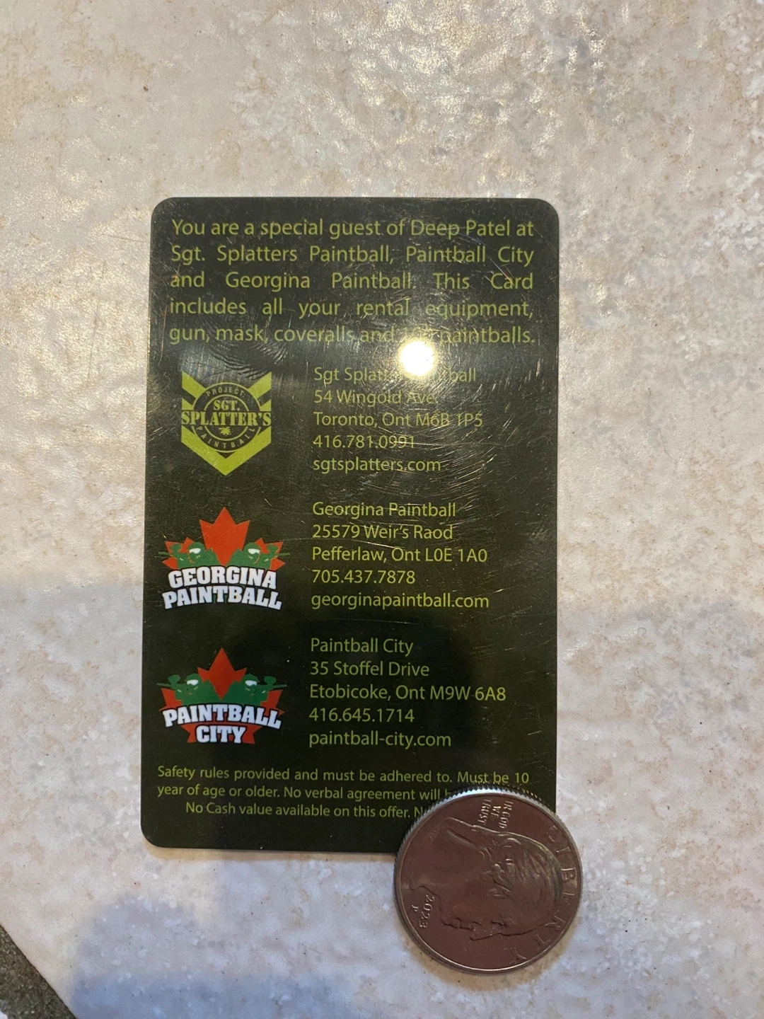 This is a special guest VIP card for Sgt. Splatters Paintball, Georgina paintball and paintball city . The card includes rental equipment, gun, mask, overalls, and paintballs. Enjoy!
