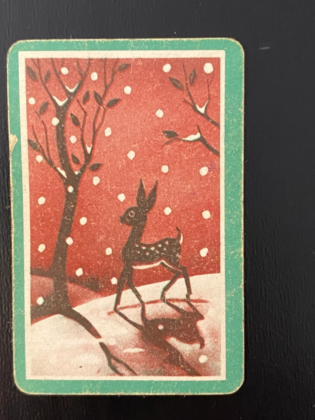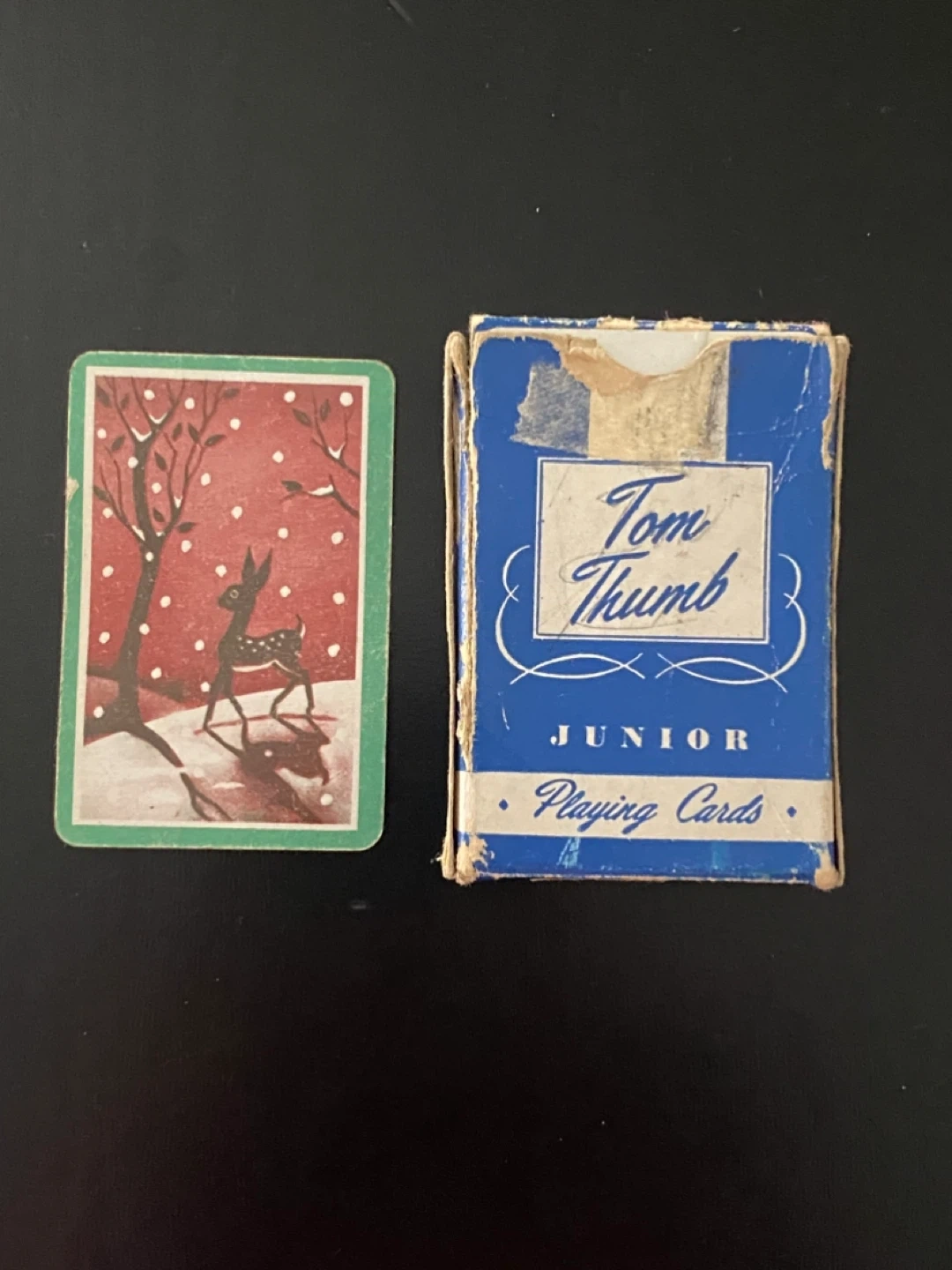 Selling a complete deck of vintage “Tom Thumb Junior”playing cards with a deer snow scene! 1950’s- 1960’s “Tom Thumb Junior” playing cards by Arrco Playing Card Co. Chicago Measures 2” x 2.5” Complete set with 2 Jokers. Great for the collector! Cash and pick up only, Cawthra and Lakeshore area in Mississauga.