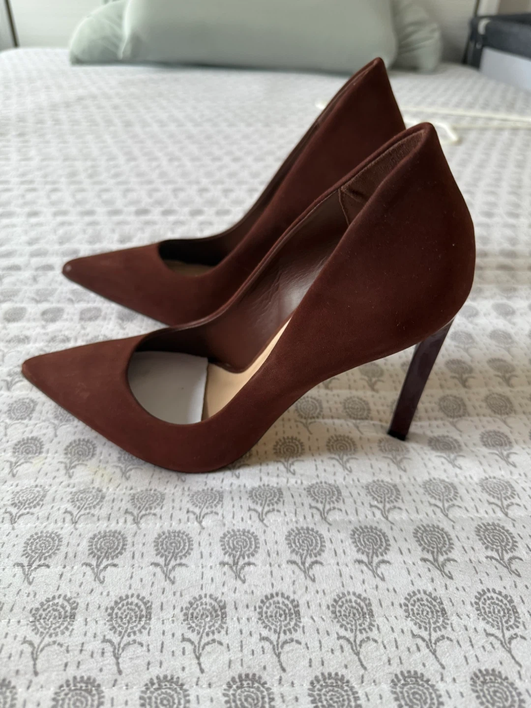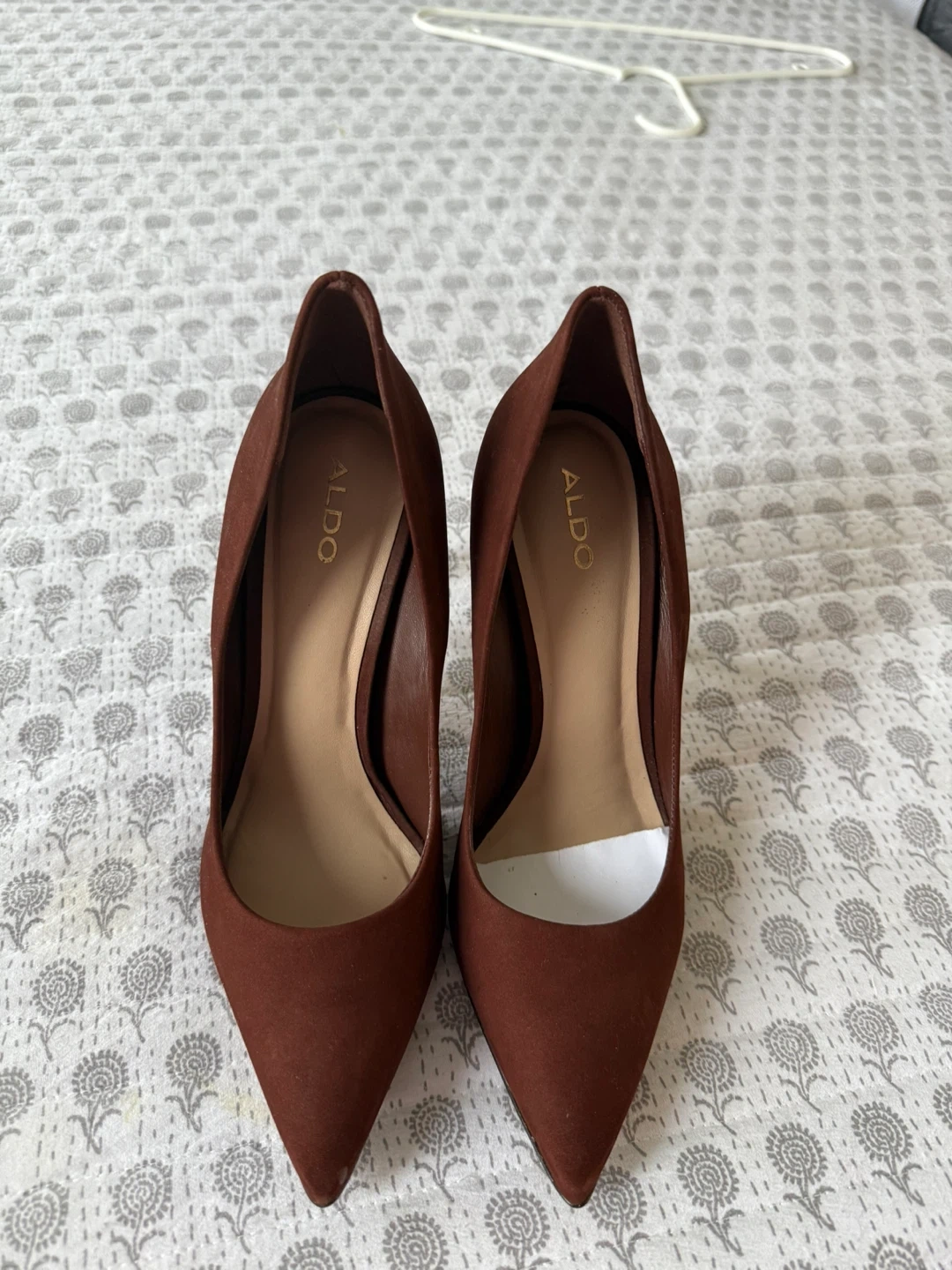 These are a pair of ALDO heels in a beautiful brown suede material. They would be a great addition to any wardrobe