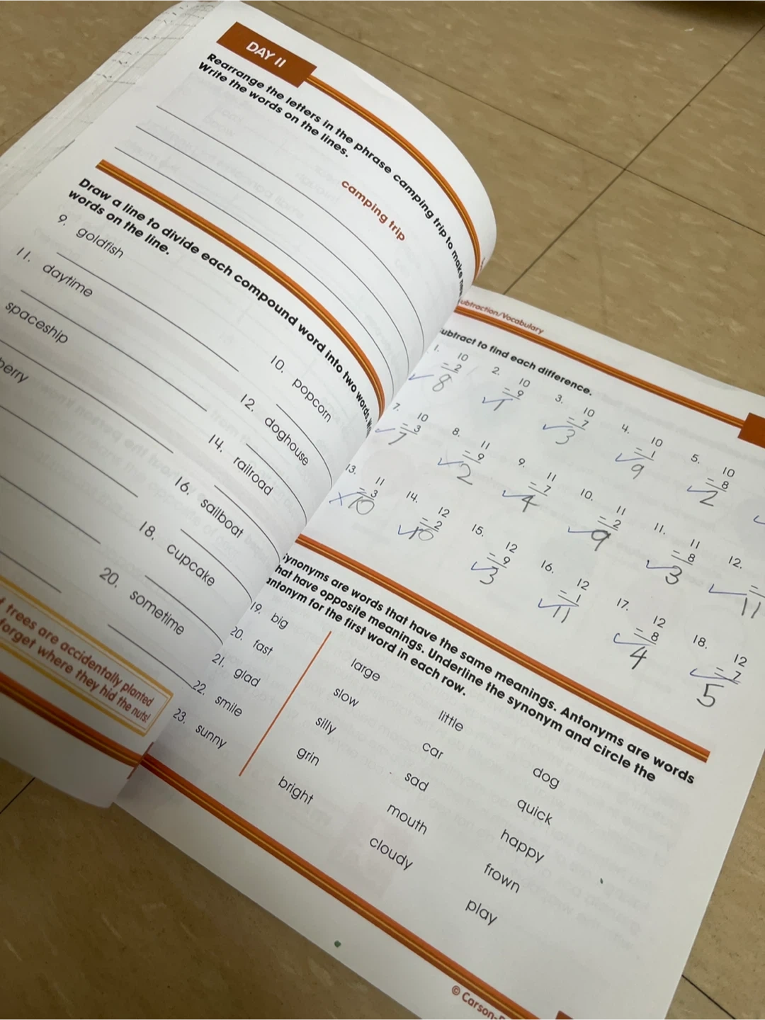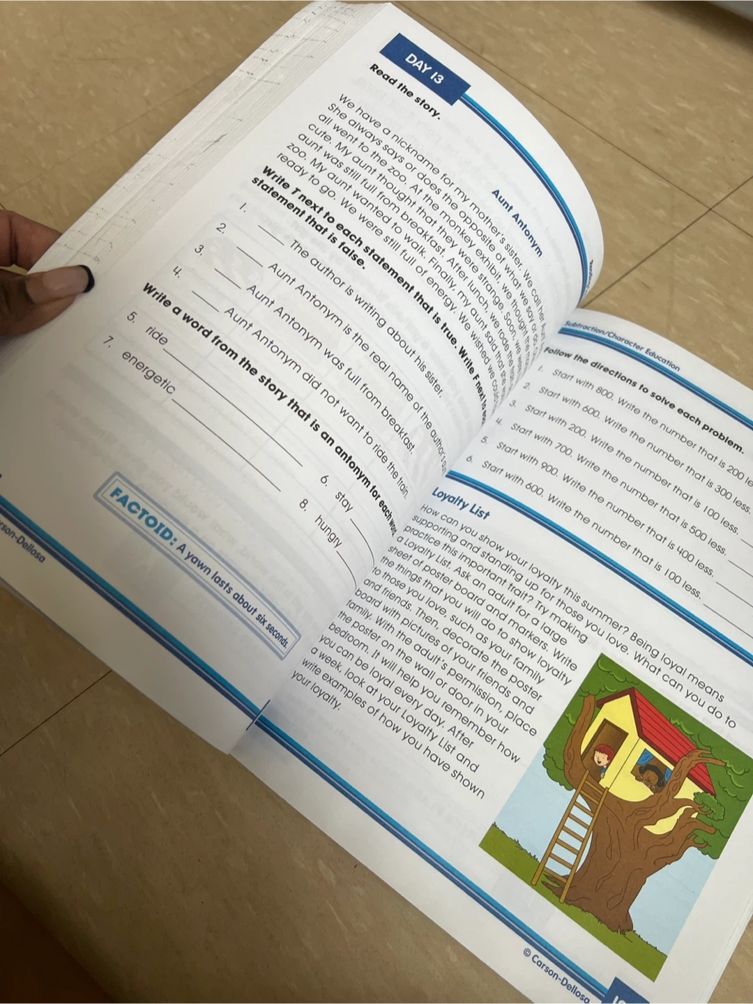 Summer Bridge Activities workbook for grades 1-2. It includes reading, writing, math, science, social studies, and fitness exercises. There are also bonus flash cards and stickers included