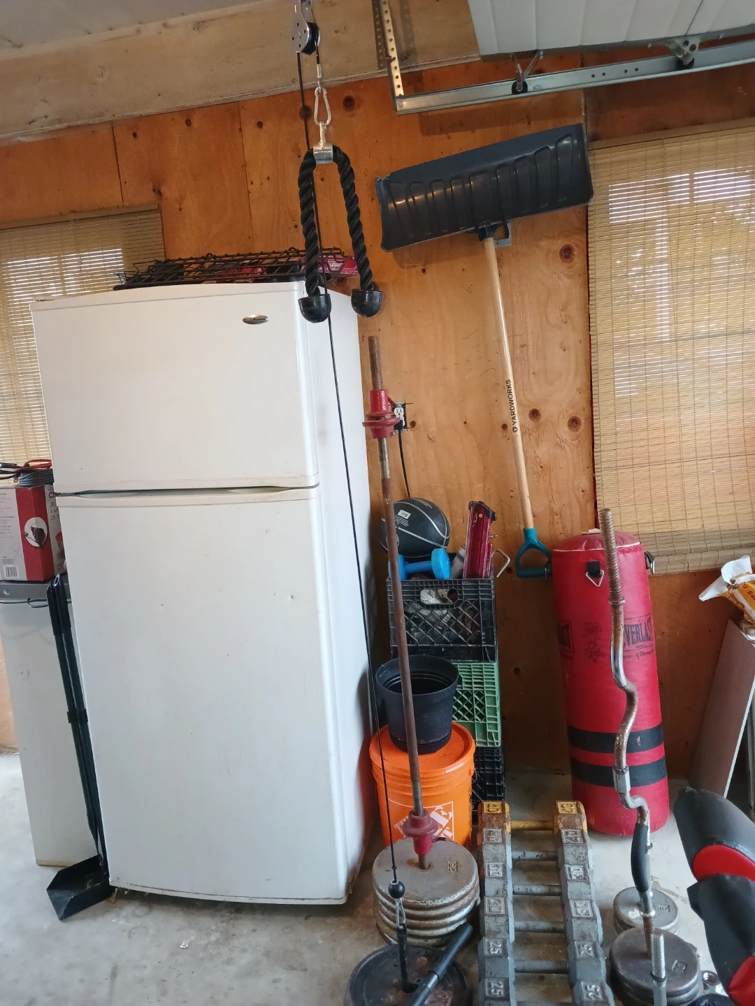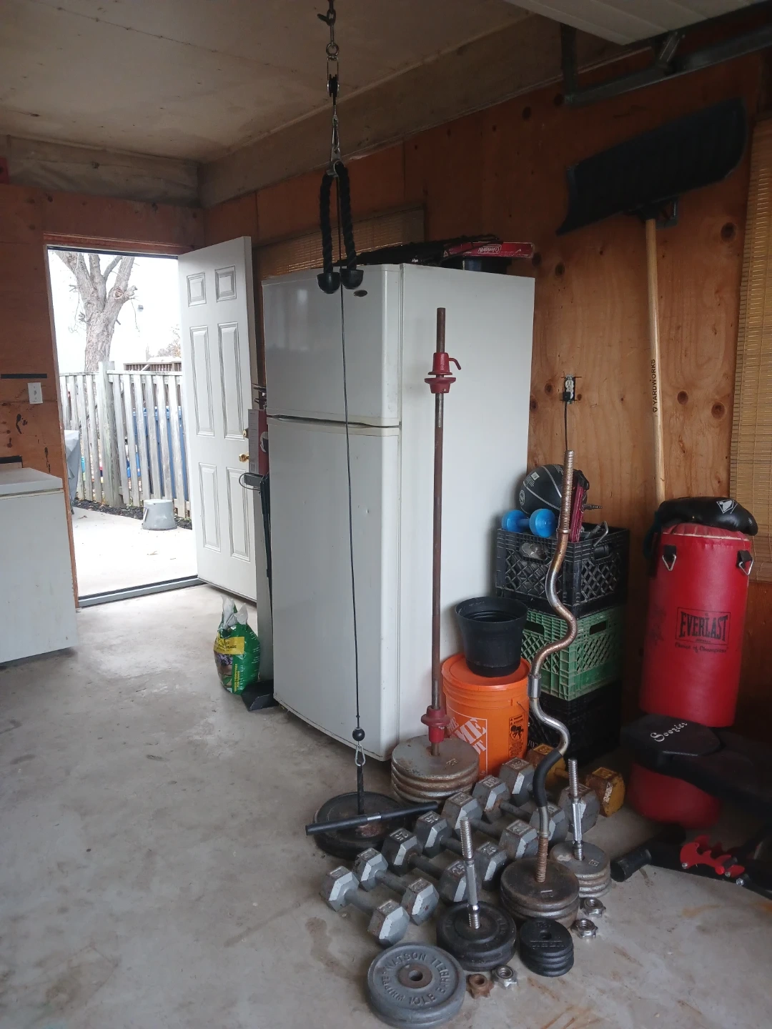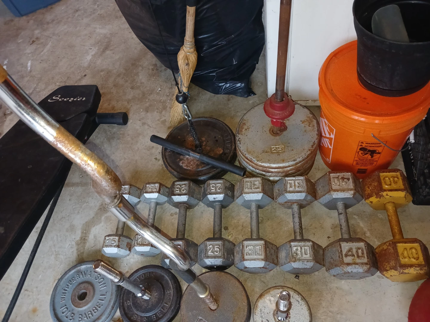 Selling a used weight set that includes various dumbbells, weight plates, and a Soozier weight bench. The dumbbells range from 25 to 40 lbs. The weight plates are also included. The bench is a Soozier brand.
