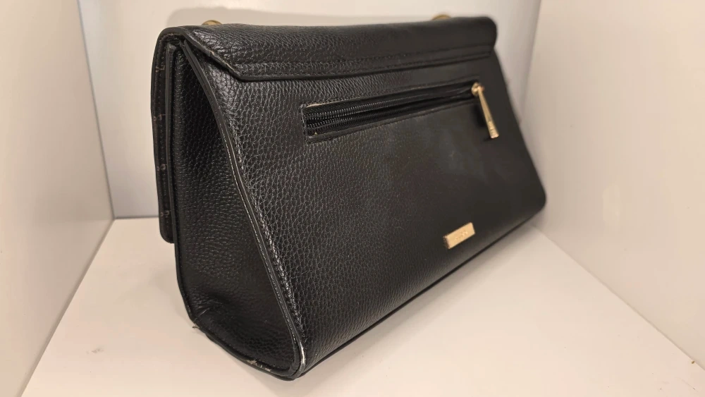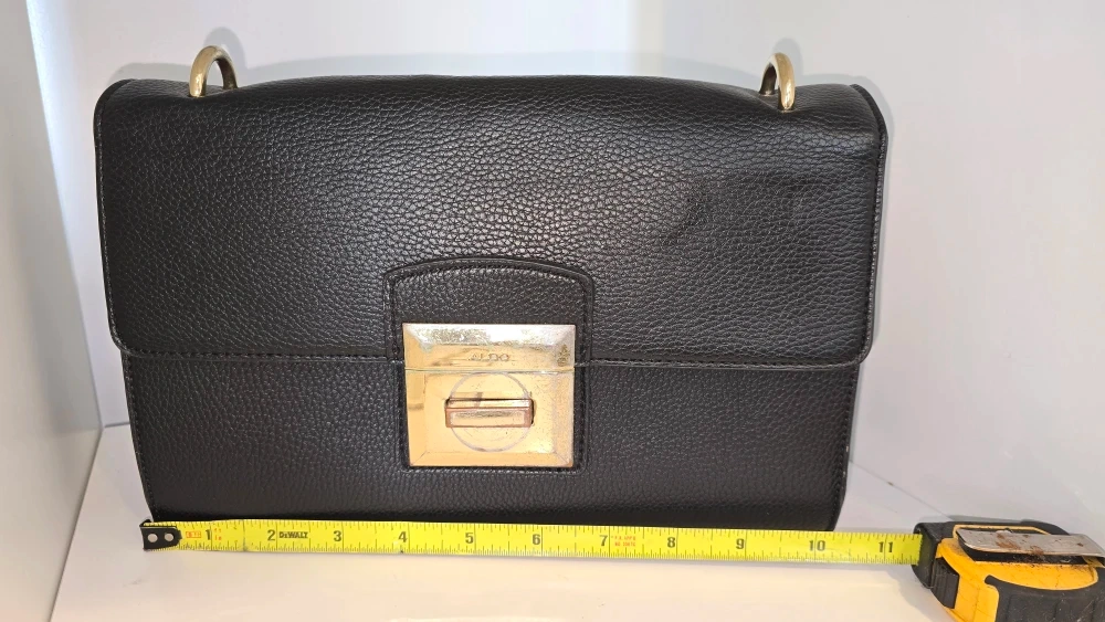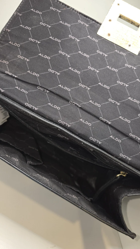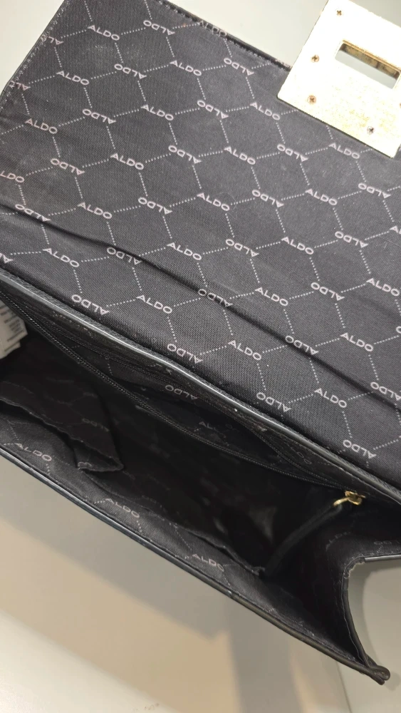 #gifting Aldo handbag in black. It's in great condition latch metal area is tarnished you could paint with Polish to touch it up and some scuffs on edge of bag could be touched up with black marker there is no strap... perfect for everyday use or a night out. The interior is lined with Aldo's signature logo pattern. It features a secure closure and a convenient back zipper pocket.
