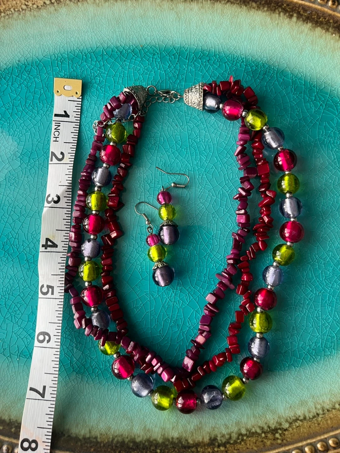Beautiful necklace and earring set with colourful beads! The necklace has a three-strand design with red (or pink), green, and purple beads. The earrings match the necklace with the same colours.