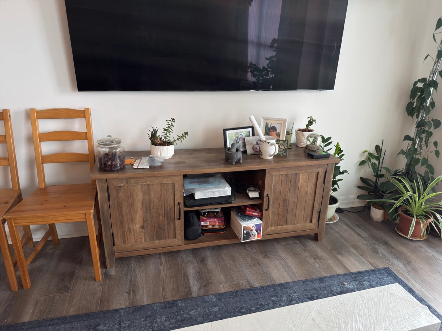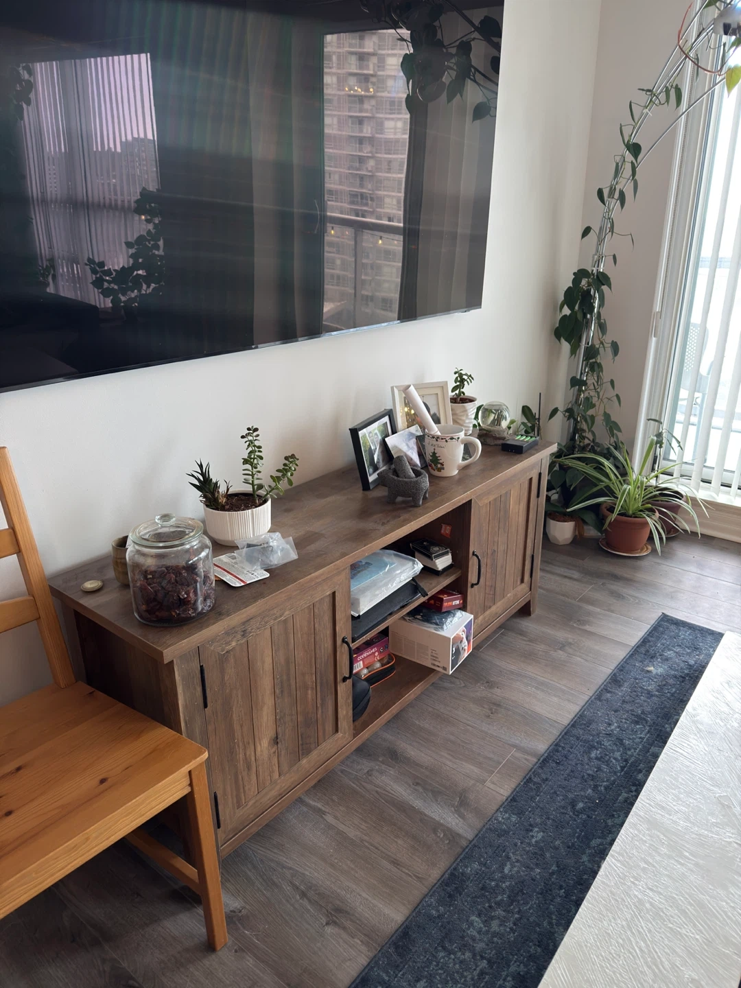 Selling a wooden TV stand in great condition! It has a rustic look and plenty of storage space for your media devices and accessories. Perfect for any living room setup!