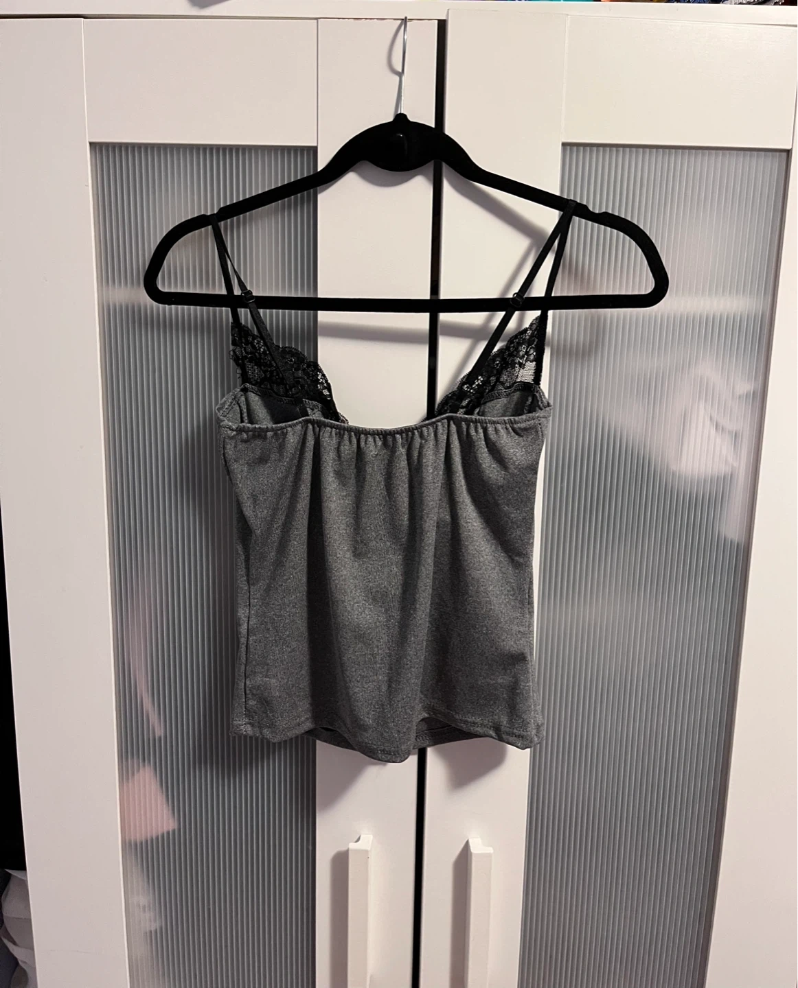 Selling a sexy cami top with lace trim detailing! It's a stylish piece that can be dressed up or down. The top is grey and features delicate black lace around the neckline and straps. Perfect for layering or wearing on its own! ☑️ Size M