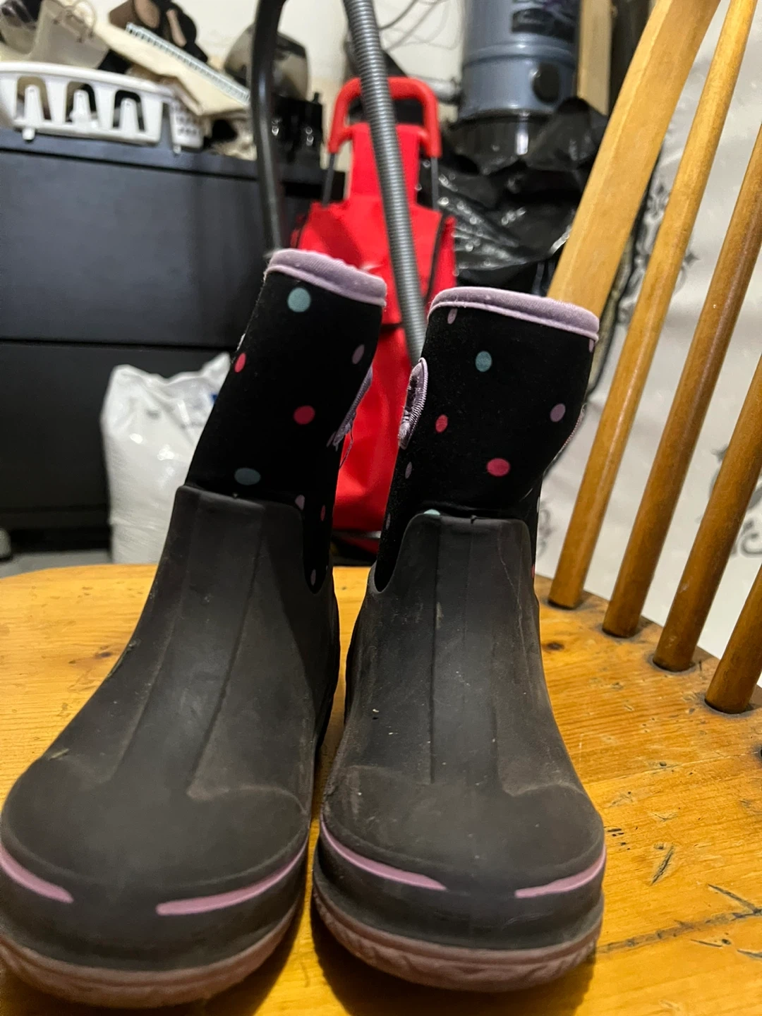 Selling a pair of Bogs rain boots in size 10. They're black with a cute polka dot pattern. Perfect for keeping little feet dry and stylish on rainy days!