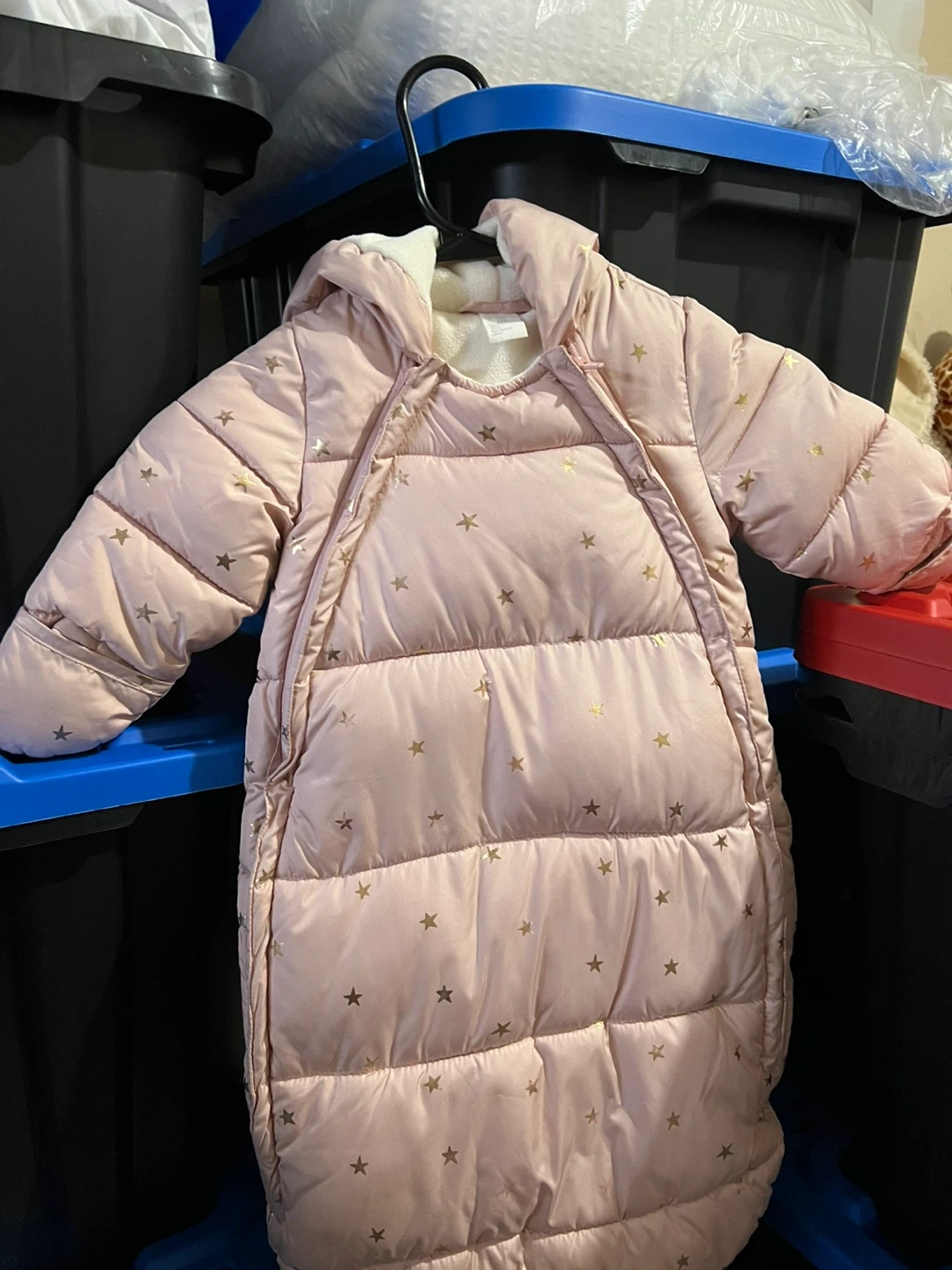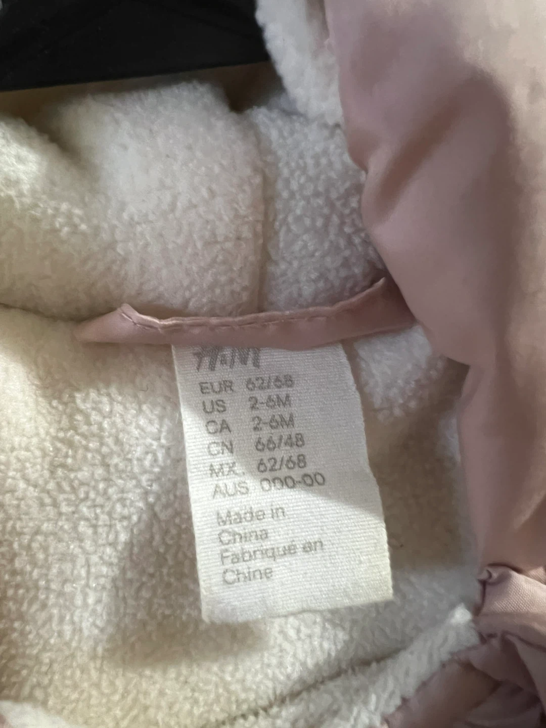 This adorable H&M baby snowsuit is perfect for keeping your little one warm and cozy! It's a beautiful light pink color with a cute star pattern. Size is 2-6 months.
