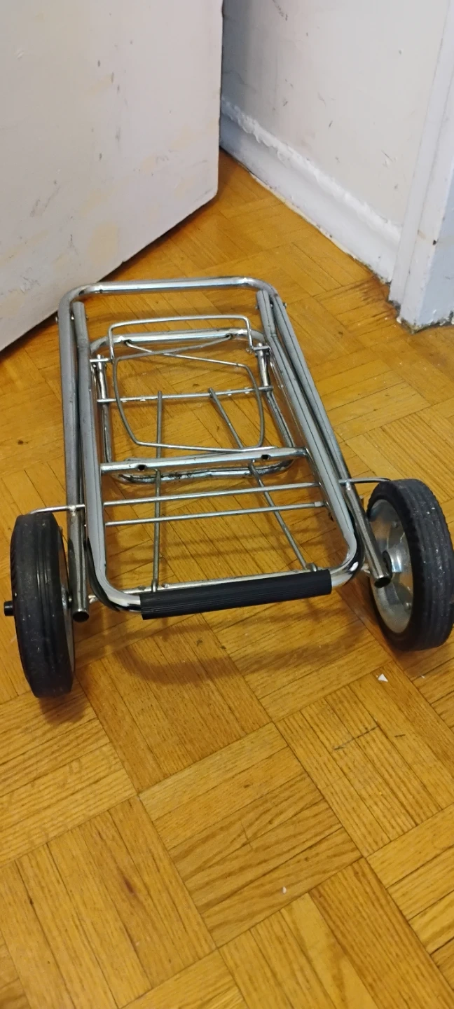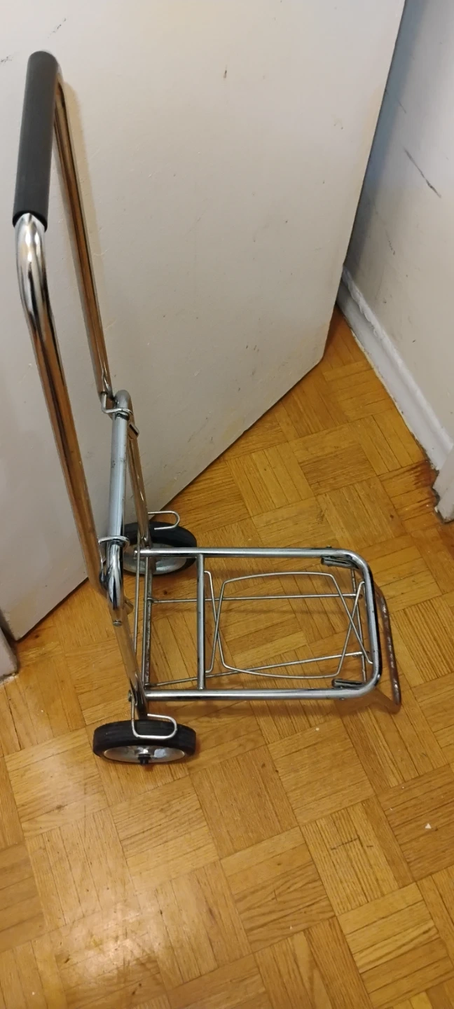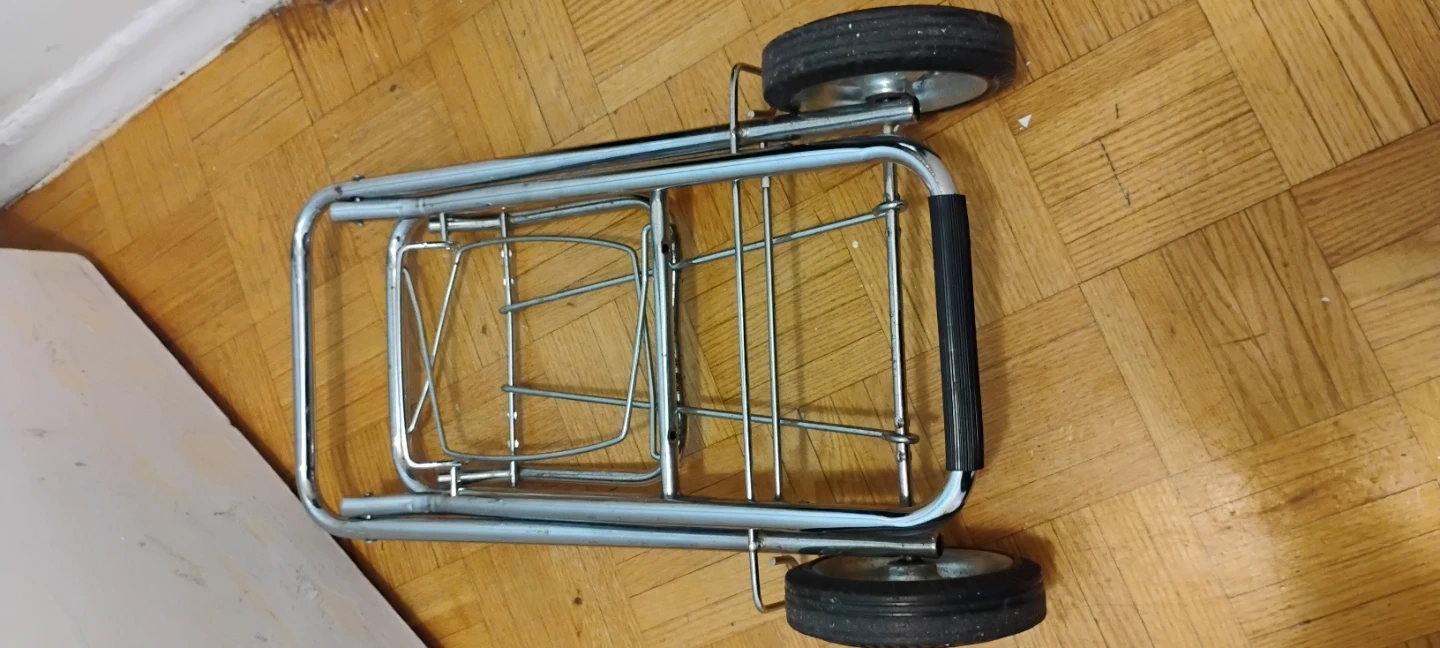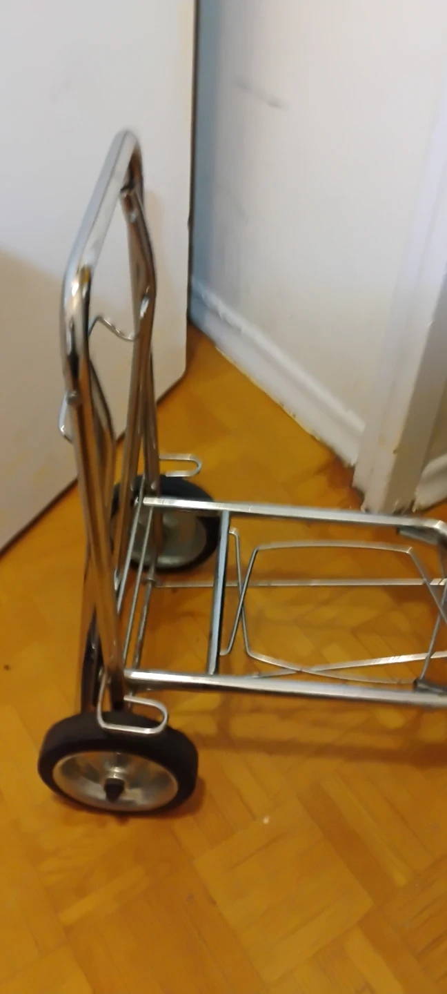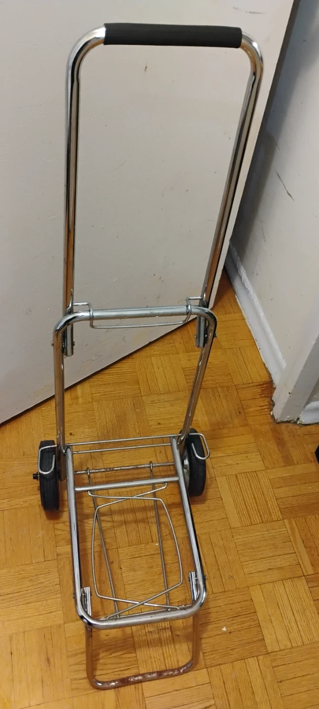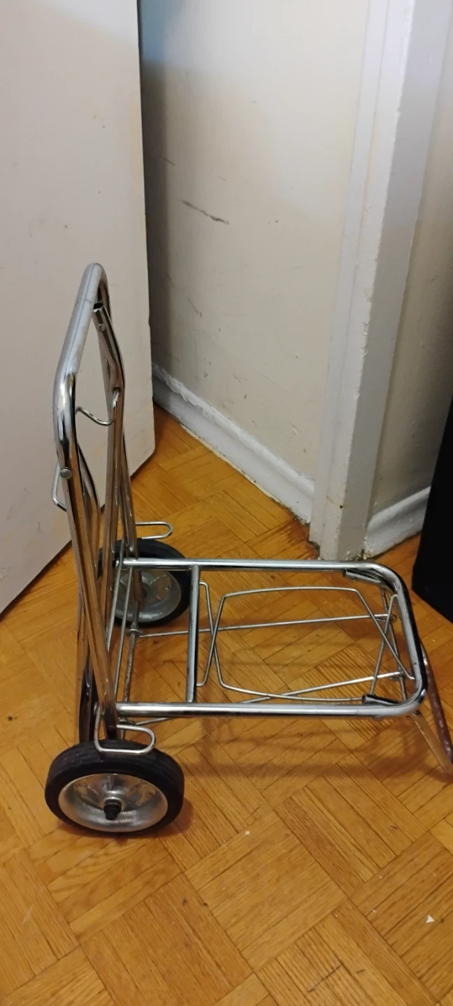 Selling a folding luggage cart in good condition. It's perfect for carrying groceries or other heavy items. The cart is made of metal and has a black handle.