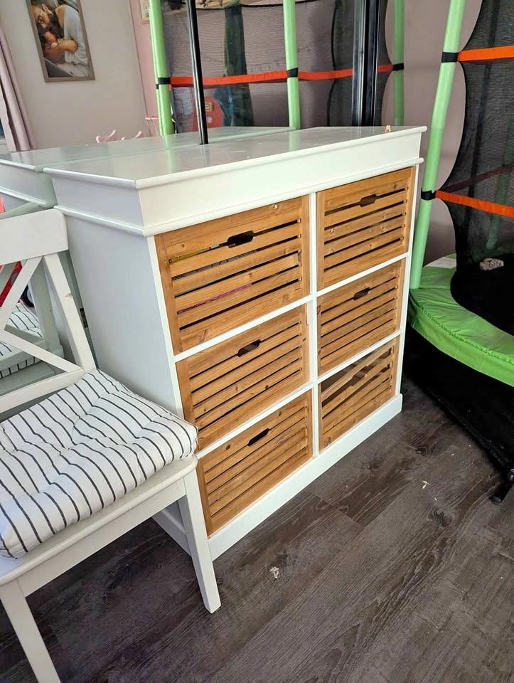 One drawer needs some fixing. All the pieces are there. Wood glue or small nails would do the trick. Deep drawers. We had our daughters clothes in there and it worked great. Measurements are in the photos. Pick up in Sherwood park.