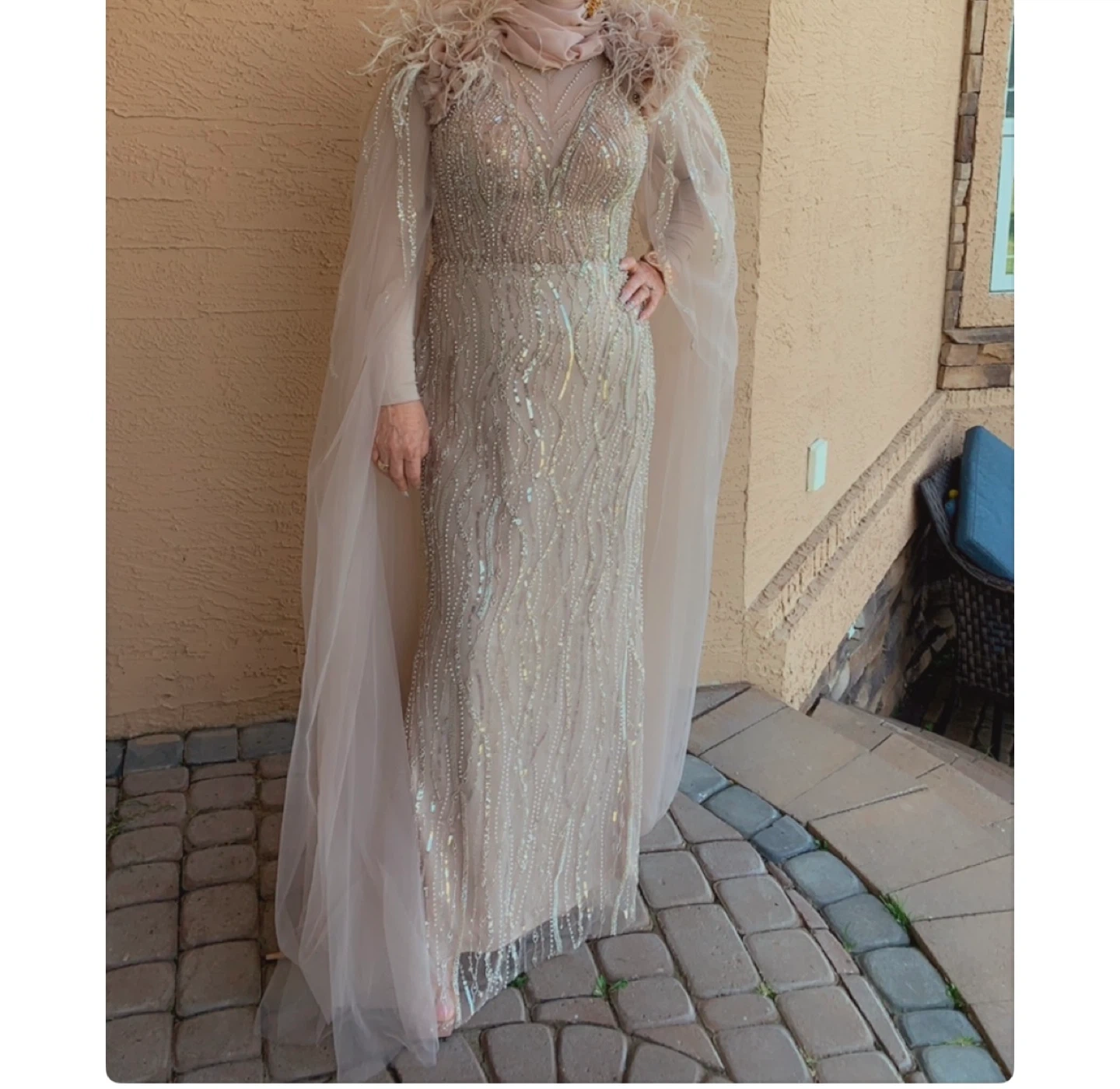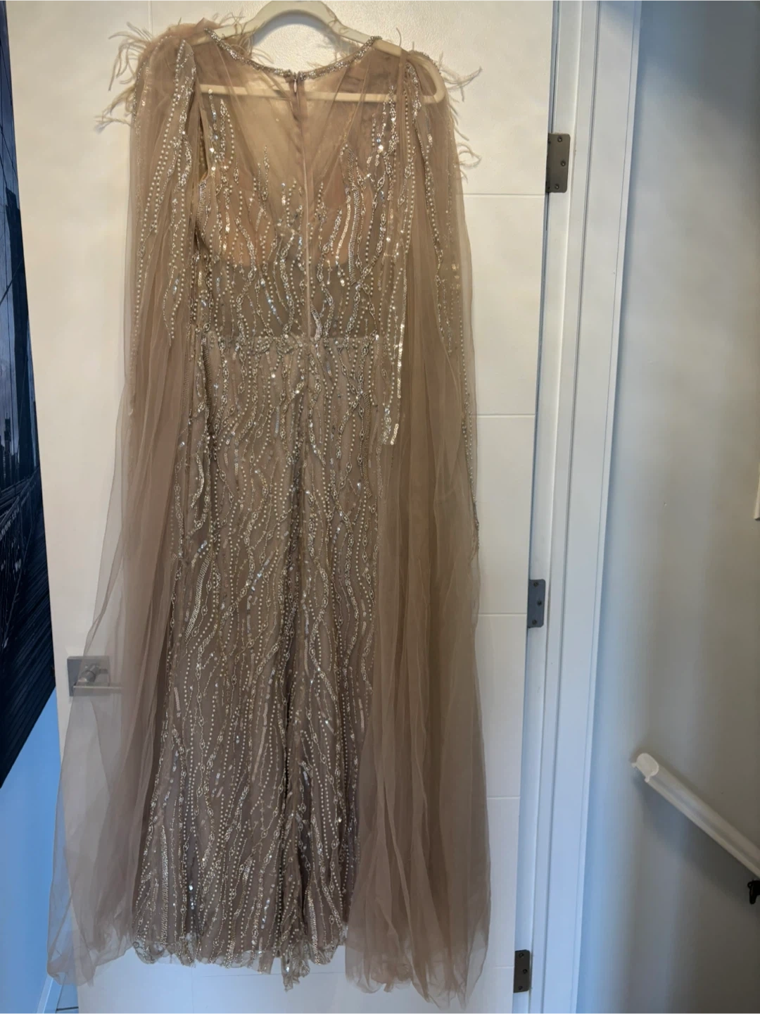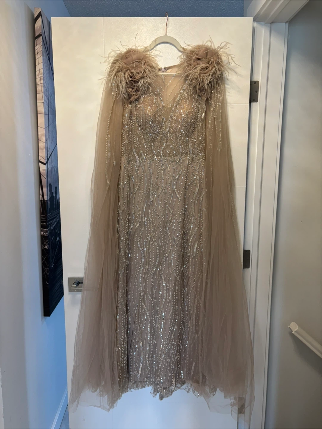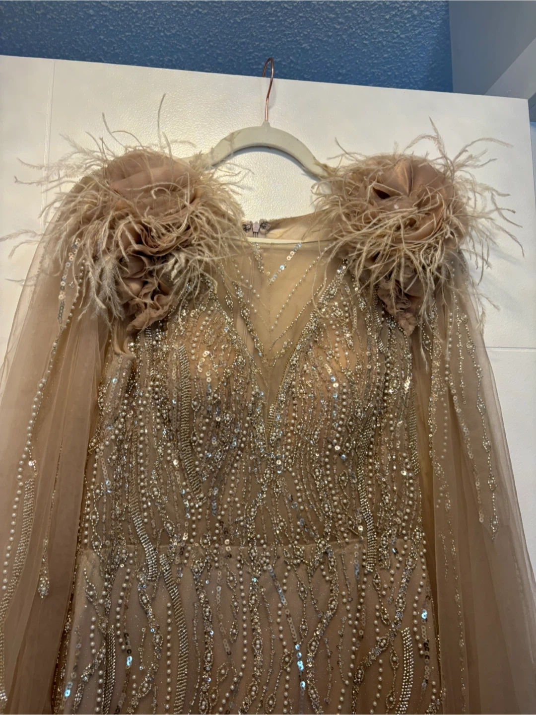 Beautiful evening dress with delicate beading and feathered shoulder detail. The dress has a sheer overlay and elegant design, perfect for a special occasion! It's in great condition and ready to make someone's evening unforgettable