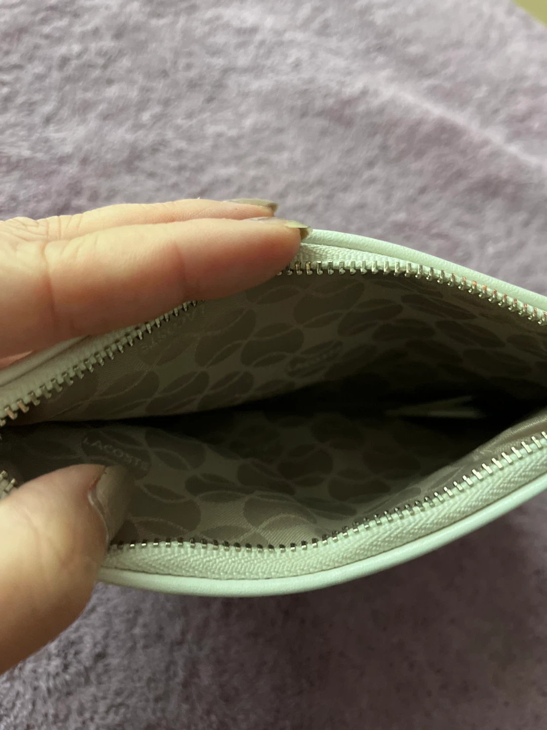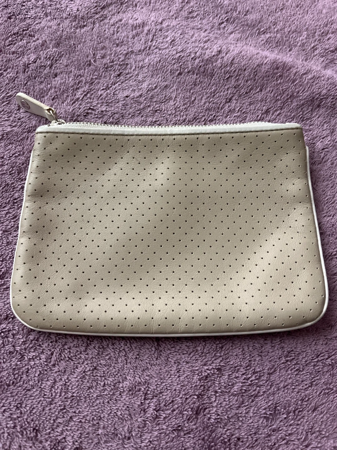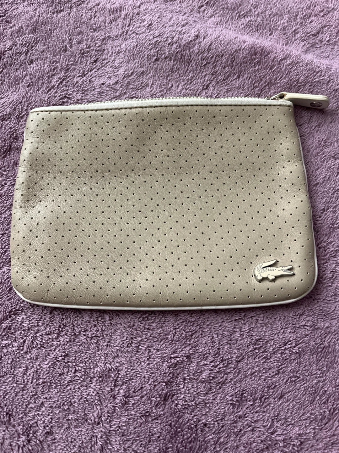 Selling a Lacoste beige pouch. It's in great condition, like new and perfect for carrying your essentials. The material feels nice and durable. It has a zipper closure to keep everything secure!