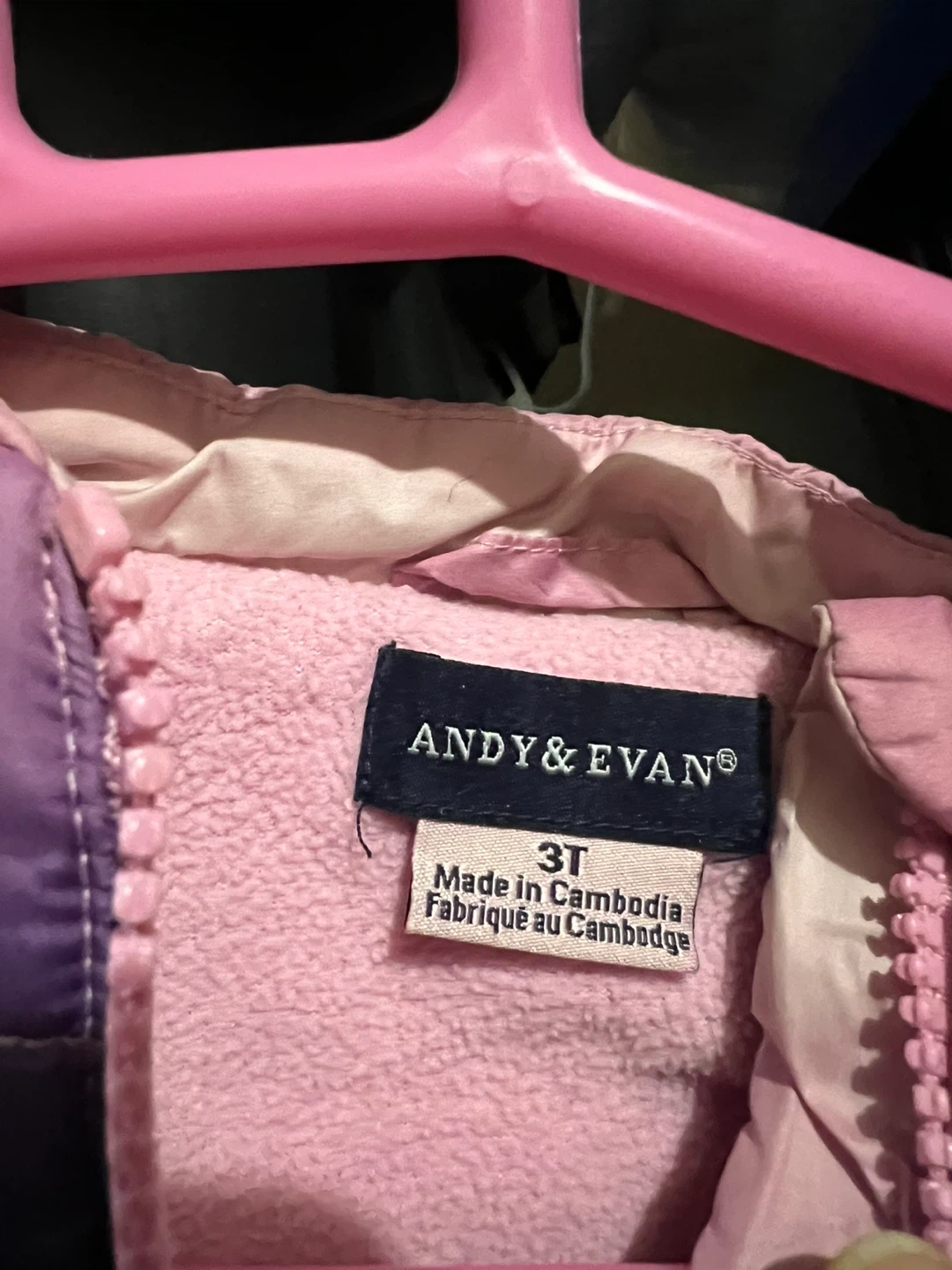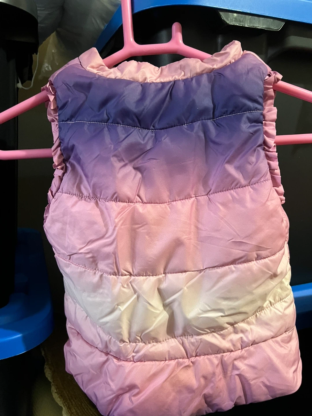 Here's a cute Andy & Evan's puffer vest in a size 3T! The vest features a gradient color scheme of purple, pink, and white. It's perfect for layering and adding a touch of style to any outfit