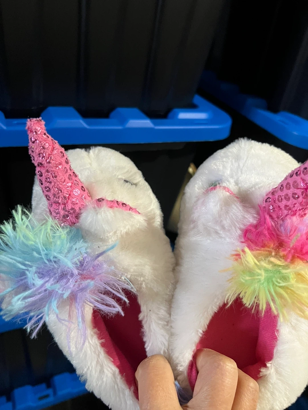 These adorable Wonder Nation unicorn slippers are in size 9-10! They feature a fluffy white exterior with a pink sequin horn and a colorful rainbow-colored mane. The soles are a light purple with non-slip grips.