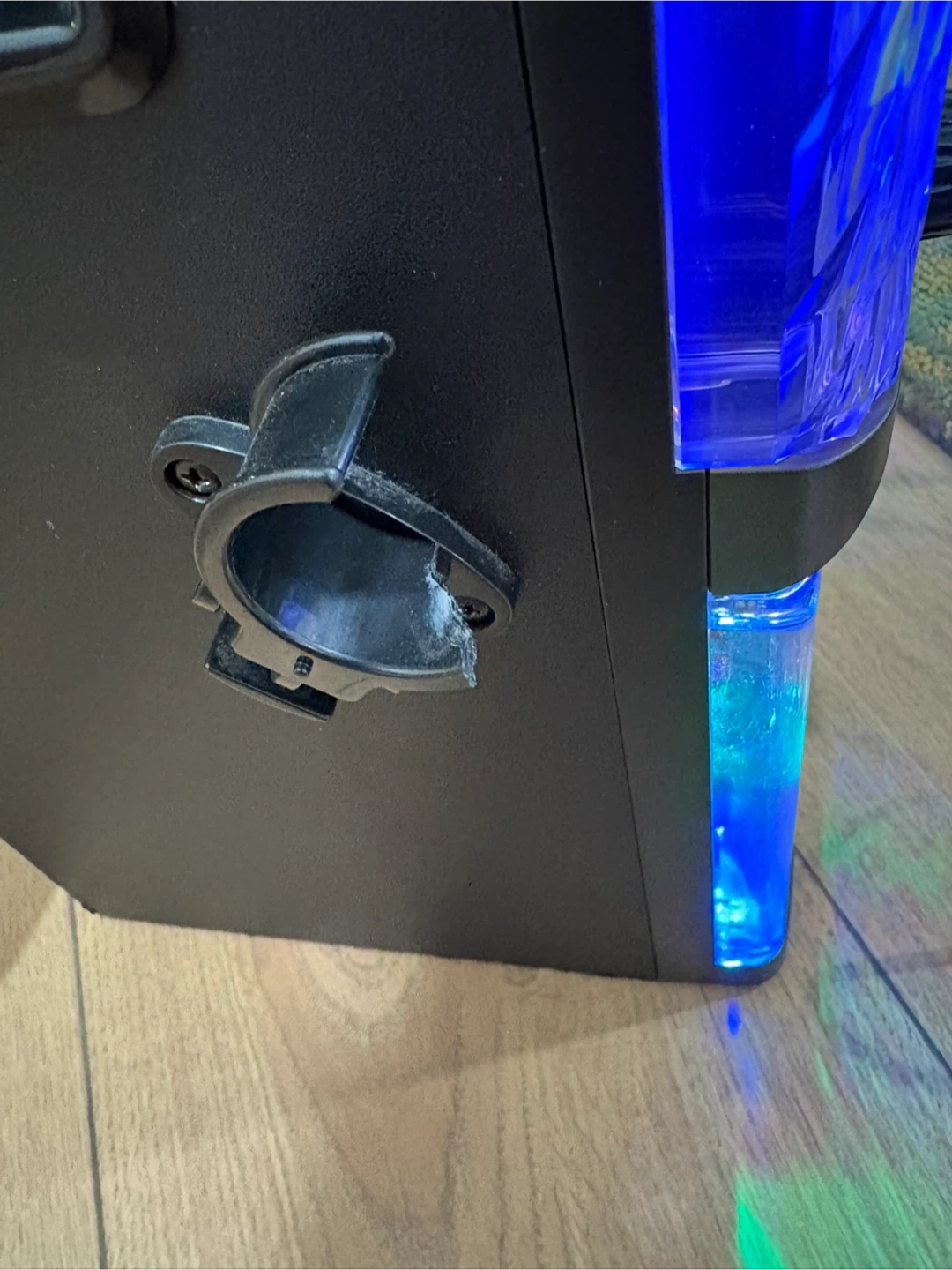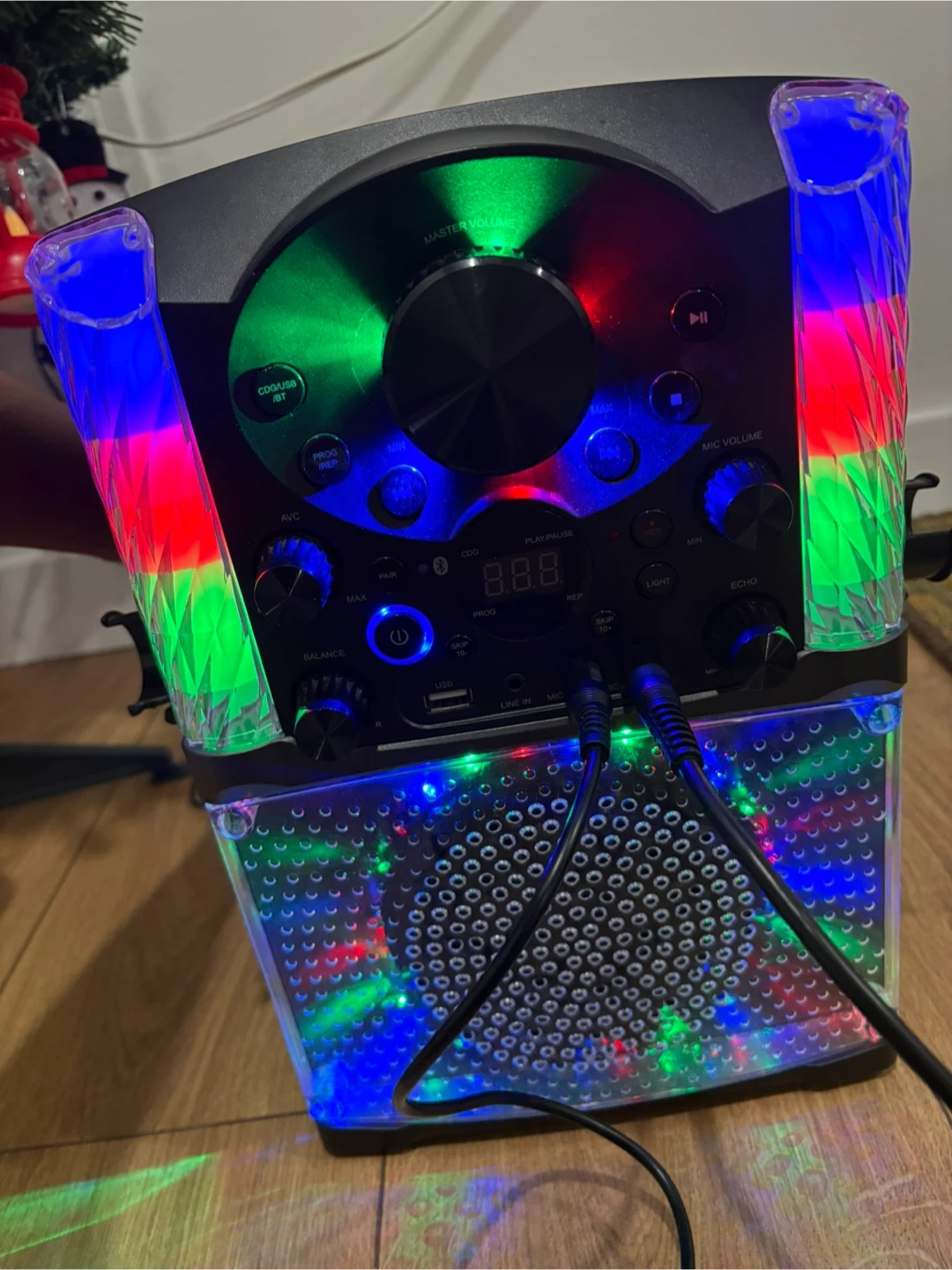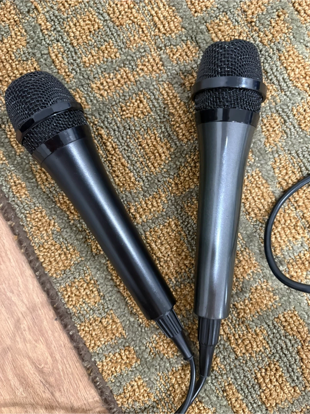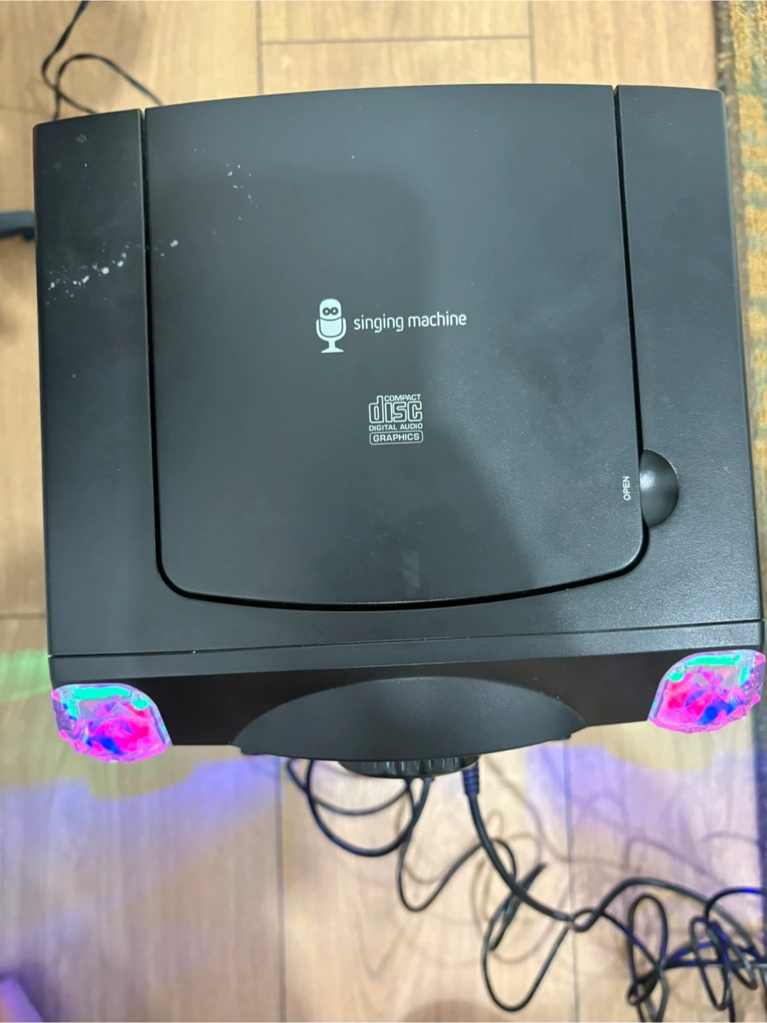 Selling a Singing Machine karaoke system. It includes two microphones and has audio/video input and output jacks. It also has a CDG/USB/BT function. It appears to be in good condition and ready for a new home! Note just one of the mix holder is damaged.