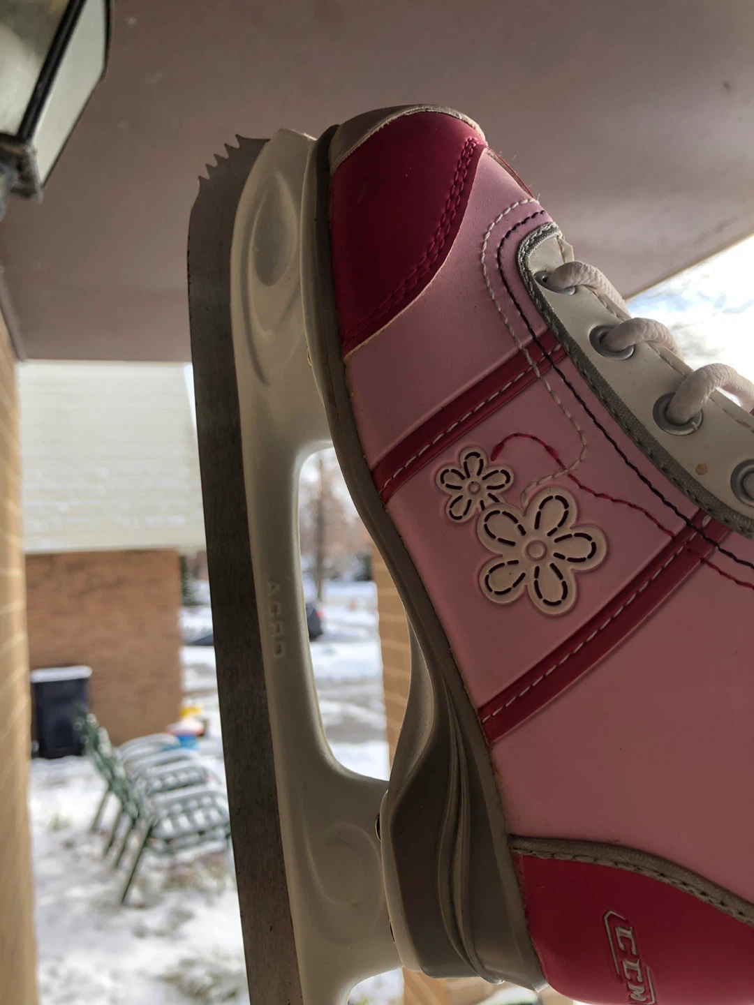 Selling a pair of CCM ice skates for girls! They're pink and white with a cute flower design. The size is 1. Perfect for hitting the ice this winter season. All sales are final.