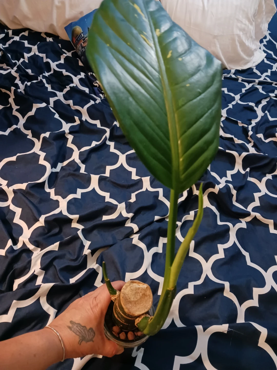 Selling Dieffenbachia or dumecane cutting in a leca. It's got a new shoot coming in, so it's ready to grow! The vase is filled with decorative stones.can be transferred in soil or keep growing like that need a new home