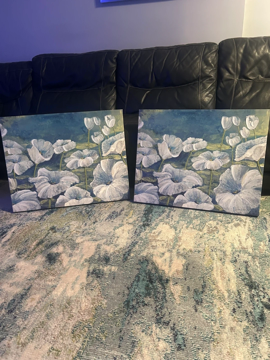 Selling a set of two floral canvas wall art pieces. They feature beautiful white flowers against a blue and green background. Perfect for adding a touch of nature to your home decor!