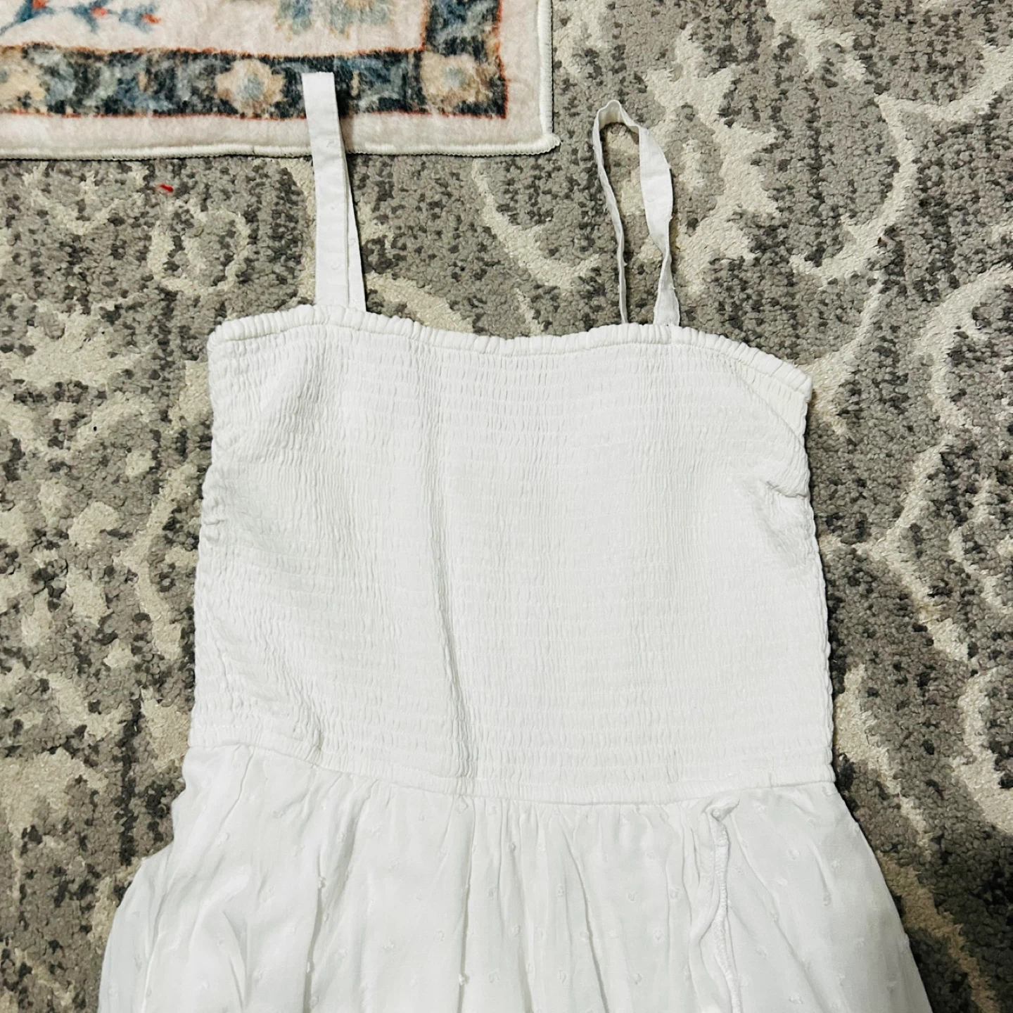 Selling a cute Hollister dress in white! It's in great condition and perfect for summer. The dress has a flowy skirt and a smocked bodice for a comfortable fit