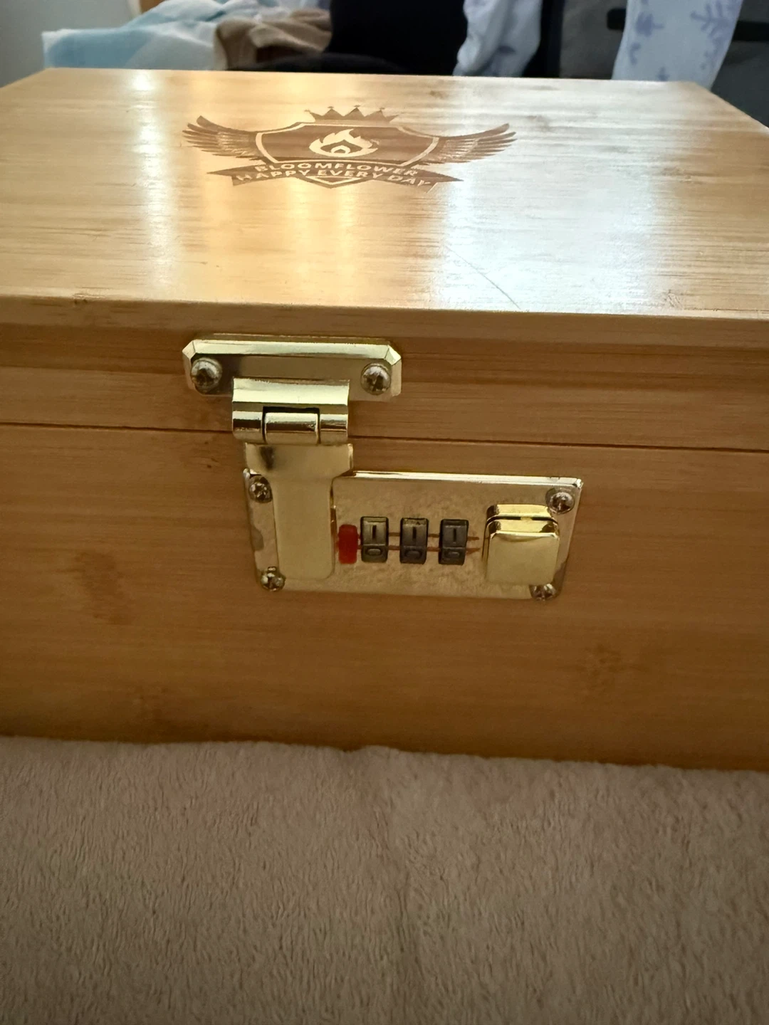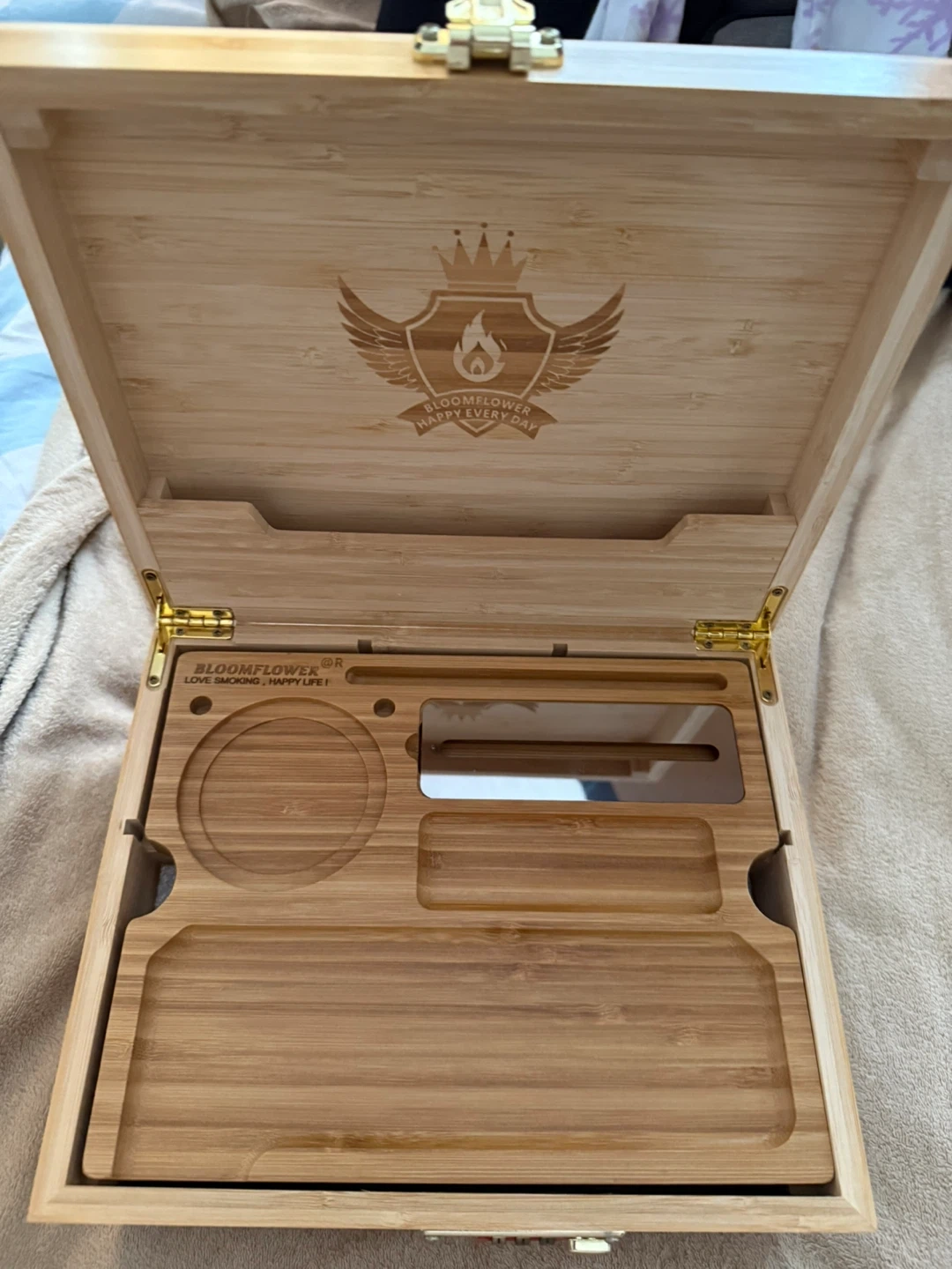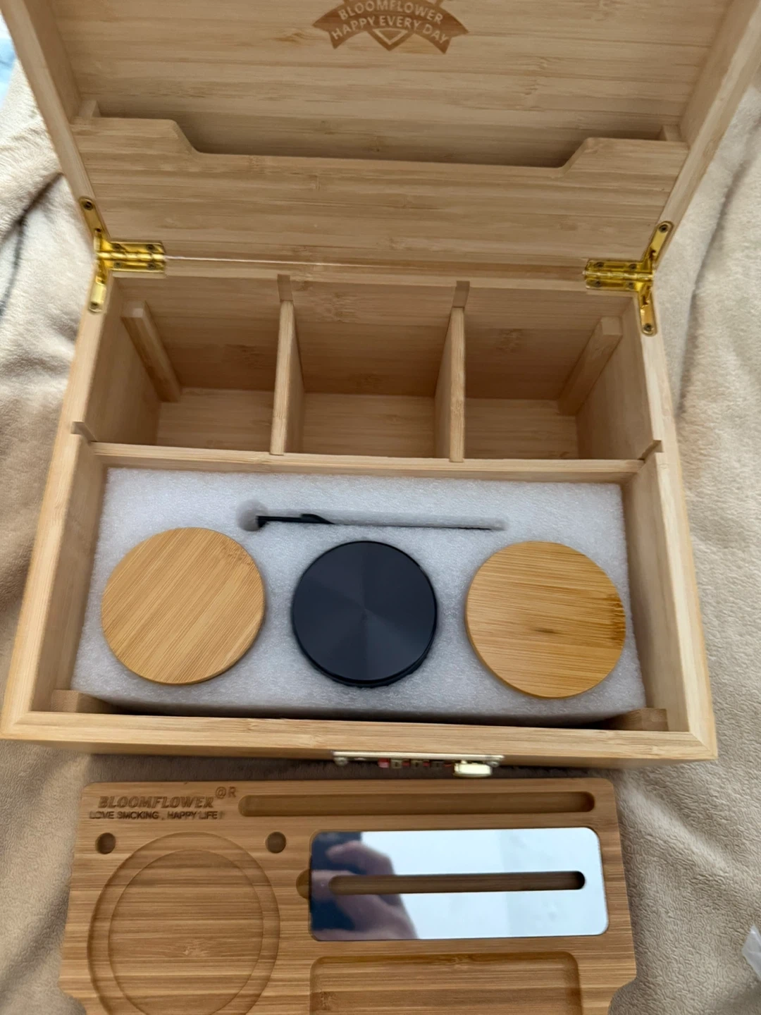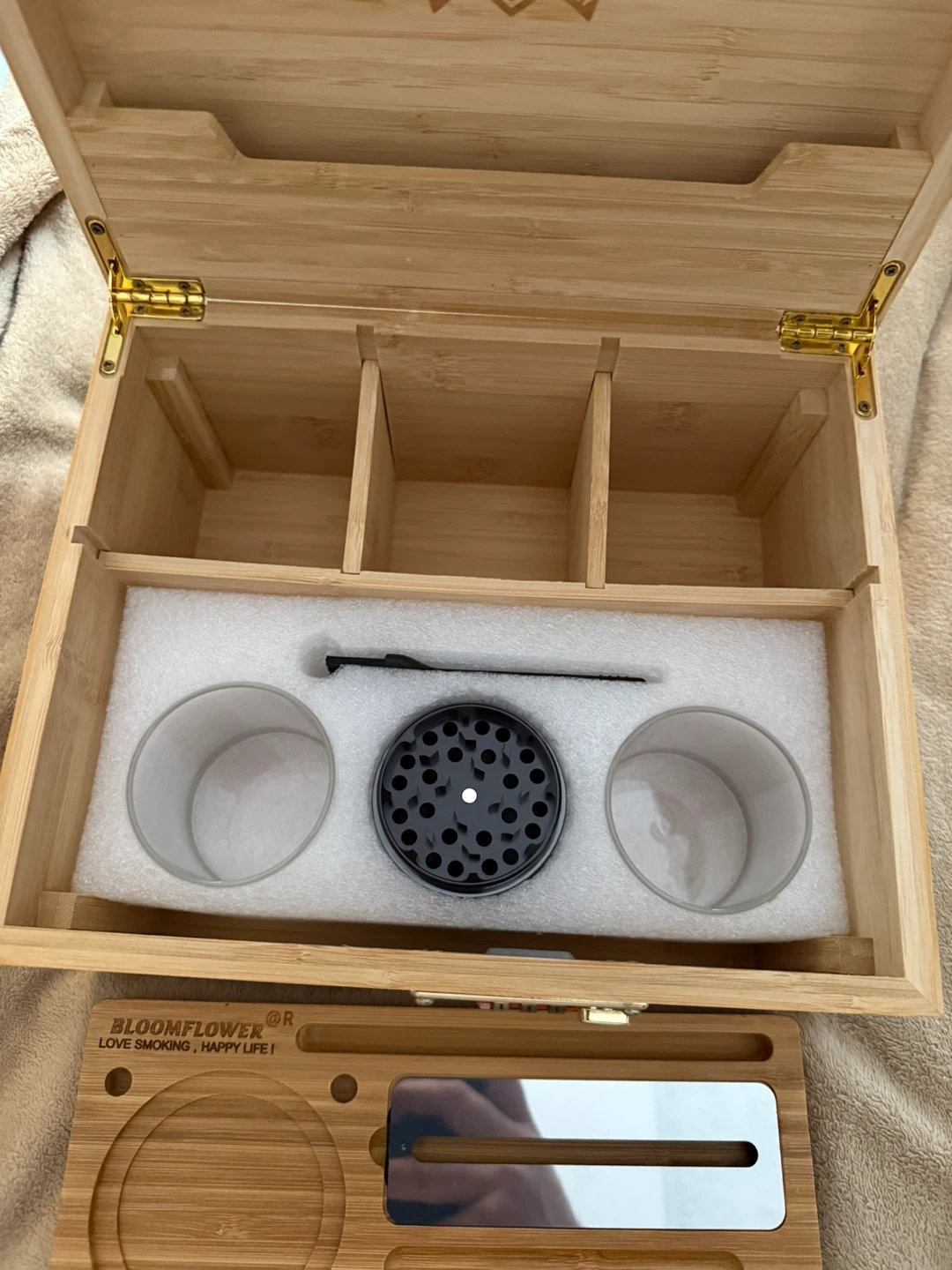 Selling a BLOOMFLOWER bamboo stash box. It comes with accessories including two glass jars, a grinder, and a small tool. The box has a combination lock to keep your items secure. It's in great condition and ready for a new home!