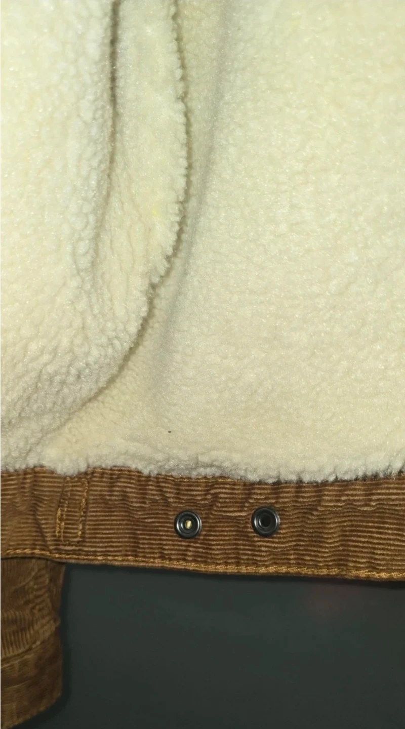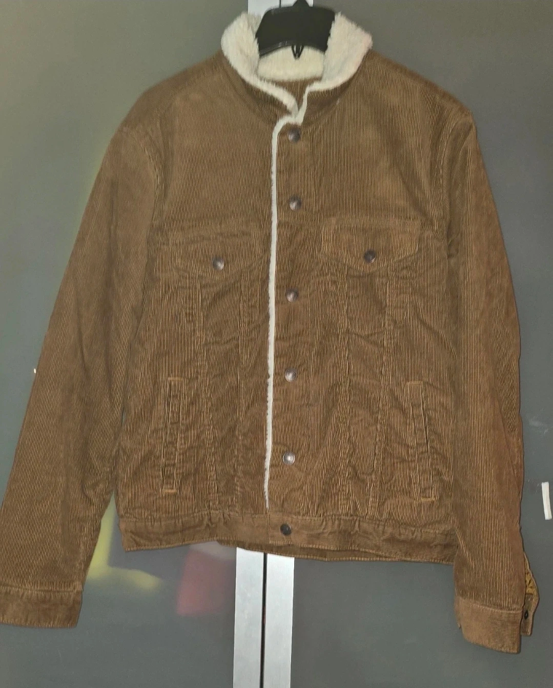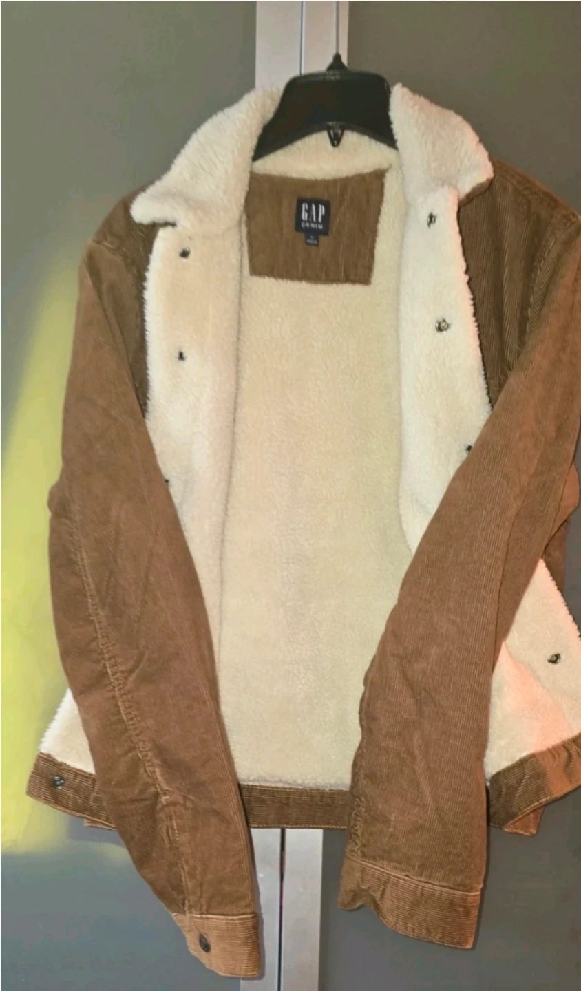 Here's a cool brown corduroy jacket from GAP! It has a cozy sherpa lining, perfect for staying warm. It features a button-up front and two chest pockets for a classic look. The jacket is New with tag