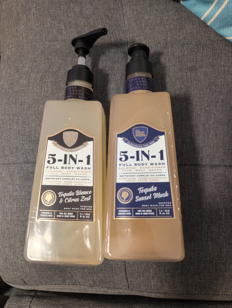 Selling two bottles of All About Men 5-IN-1 full body wash. One is Tequila Blanco & Citrus Zest, and the other is Tequila Sunset Musk. Both are paraben and sulfate-free and are suitable for all men's hair and skin types. Each bottle contains 1 L / 33.8 fl oz
