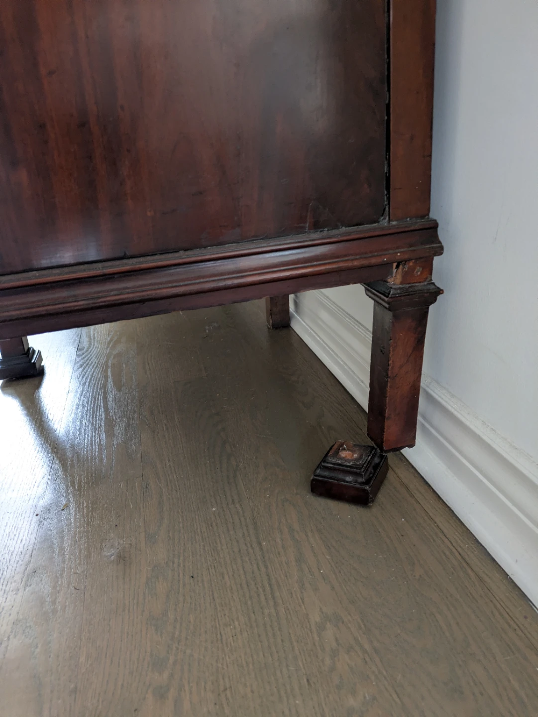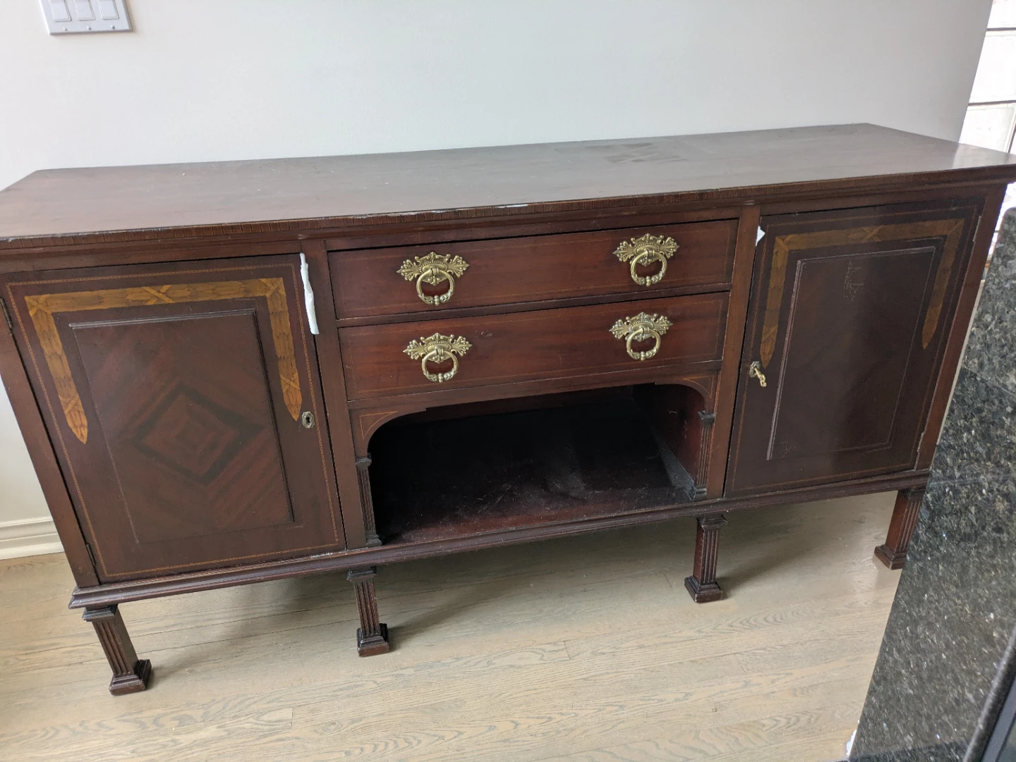 Giving away an antique mahogany sideboard. It features two drawers, two doors, and a decorative inlay. It would be a great addition to any dining room or living space!