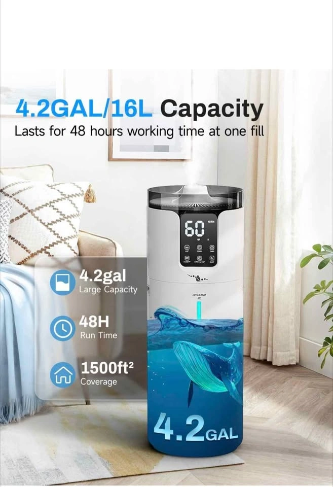 Lacidoll Humidifier large room 16L/4.2Gal - Lacidoll Whole house Humidifier for Home1500 sq.ft. Ultrasonic Cool Mist Humidifiers for Bedroom with Extension Tube & Aroma Box & Night light, White