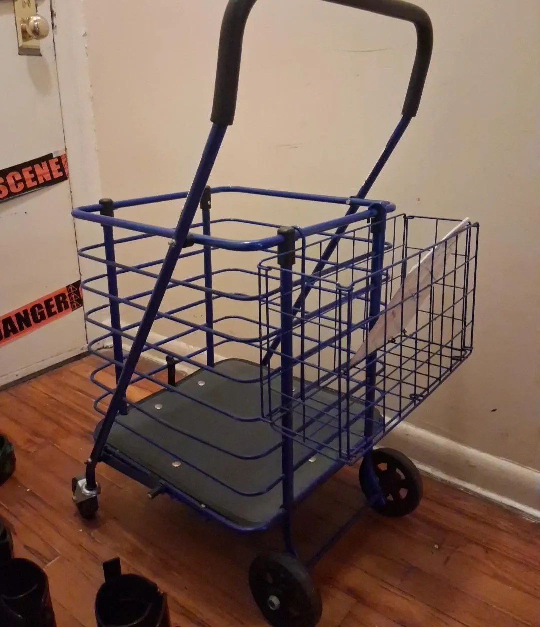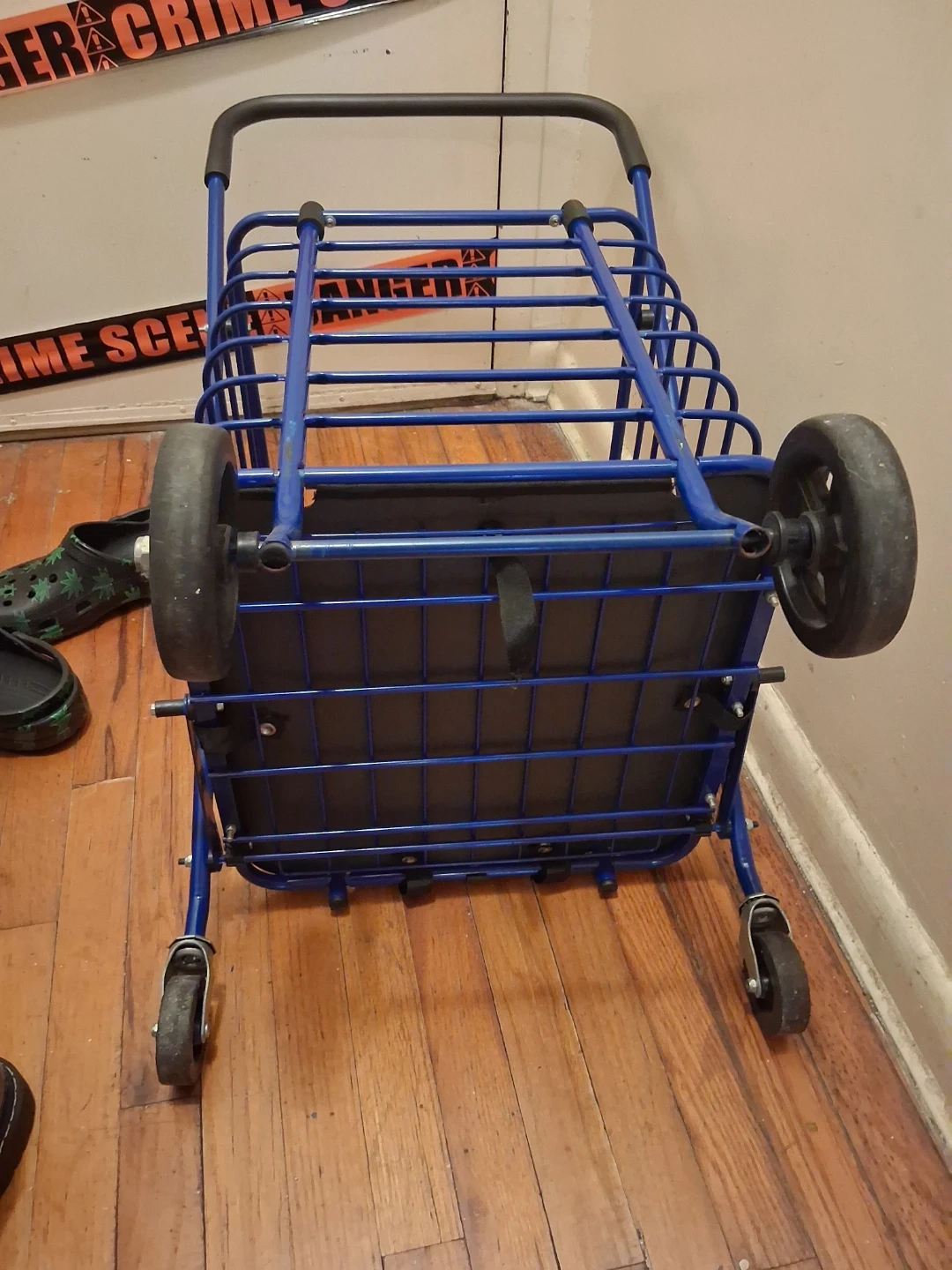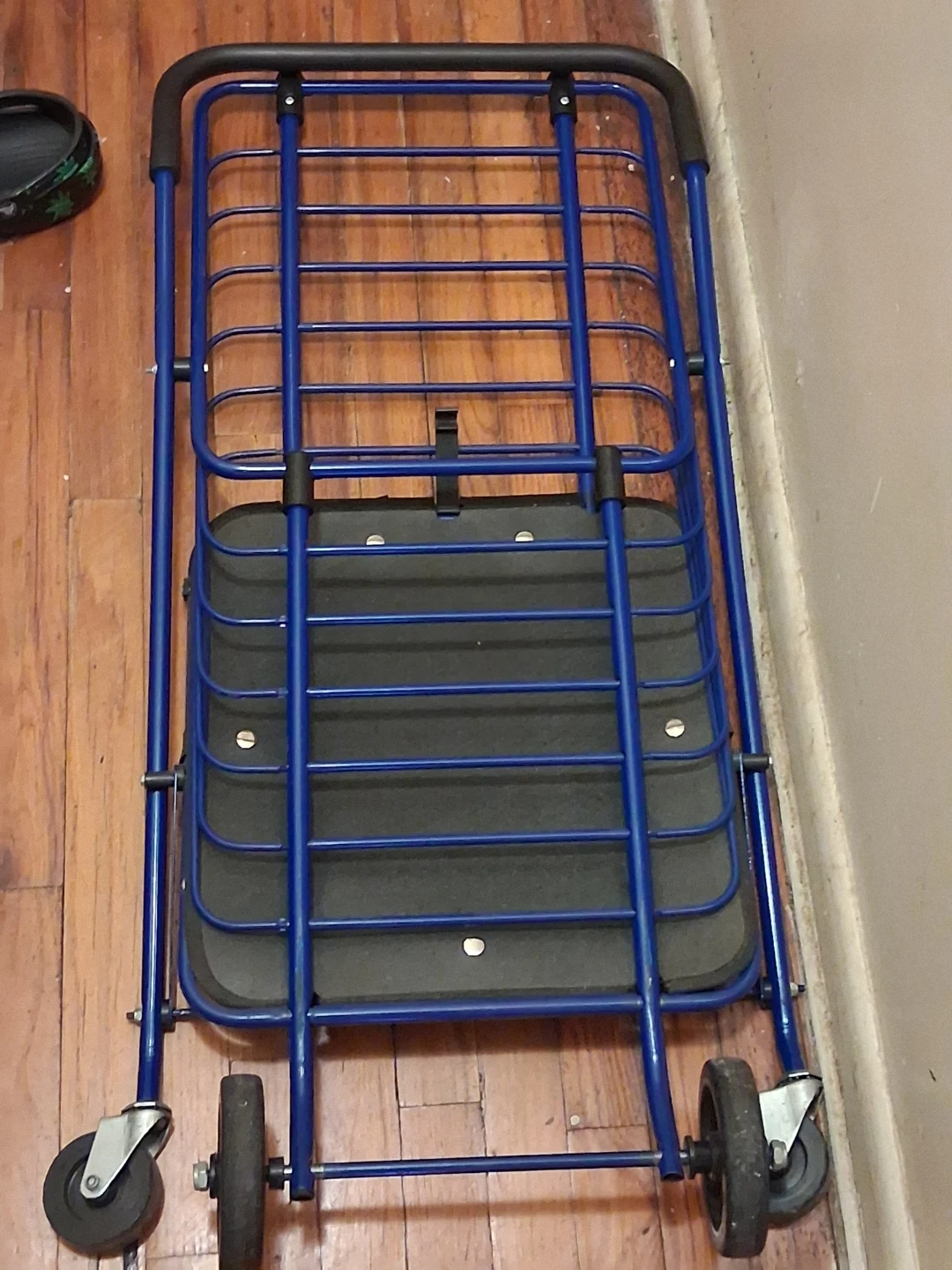 Selling a blue folding shopping cart. It has wheels and a basket for groceries or other items. Perfect for trips to the store or farmers market!