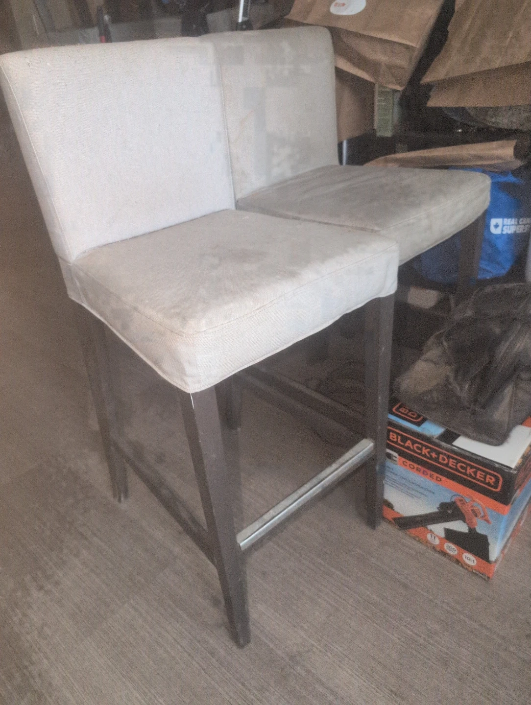 Selling two bar stools. They're beige and would look great in any kitchen or bar area. They are in used condition, but still have a lot of life left in them!