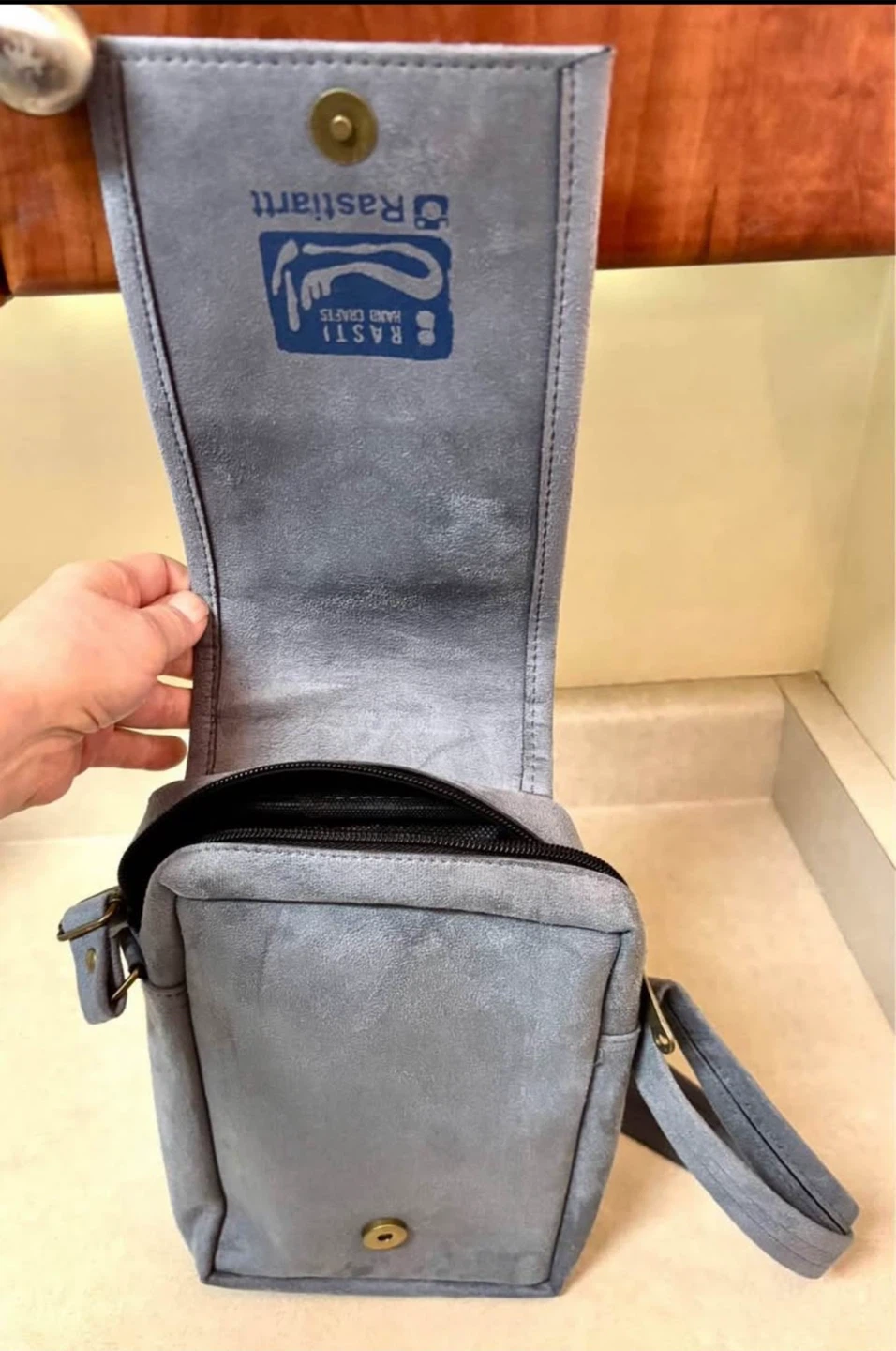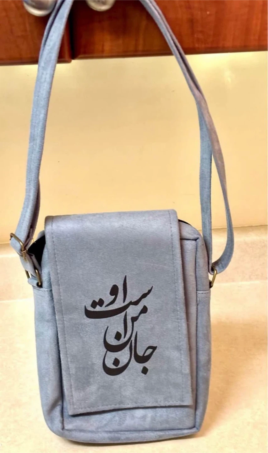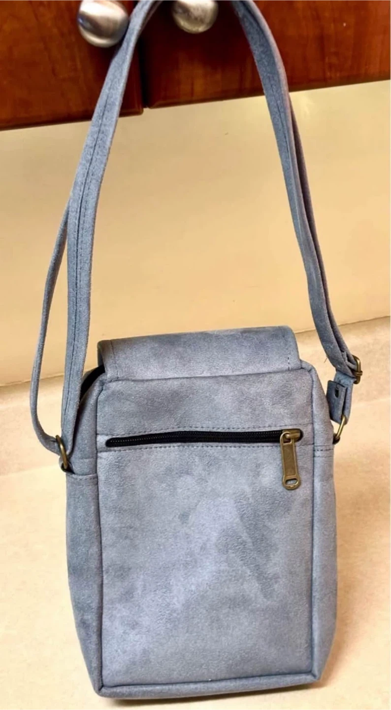 Unique blue suede crossbody bag. Features zippered closures, inside pocket and an adjustable strap.Small but functional. Arabic calligraphy design. $15 Cash only price firm.