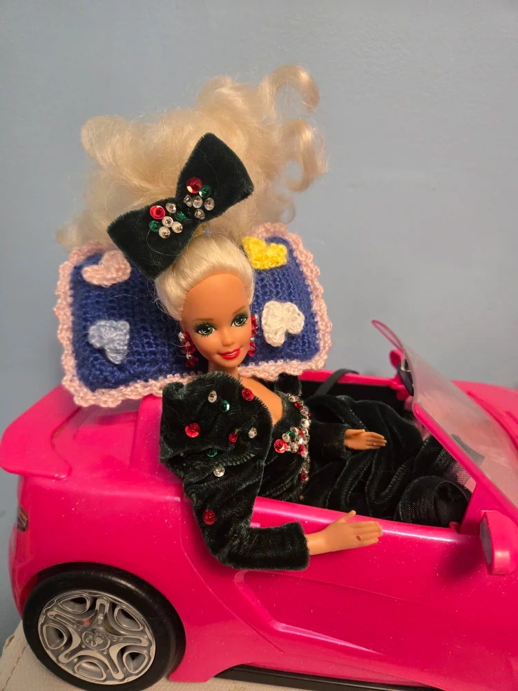 Check out this adorable handmade chrochet pillow for your favorite barbie ! It features a lovely blue base with cute heart embellishments. The edges are finished with a delicate pink trim, giving it a sweet and charming look