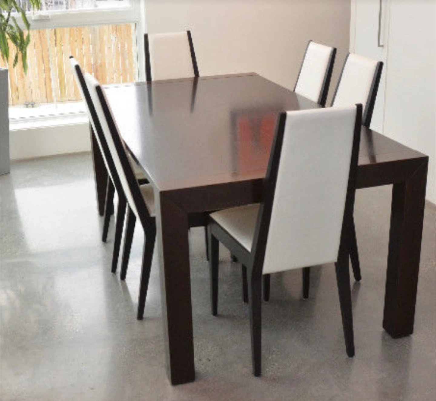 Selling a solid dark wood dining table, perfect for a modern dining room! It comes with matching chairs that have white leather like upholstery. The table is in great used condition and ready for a new home.