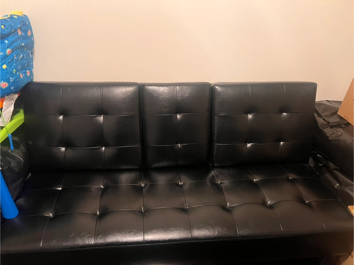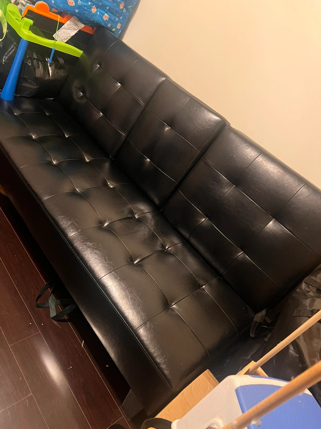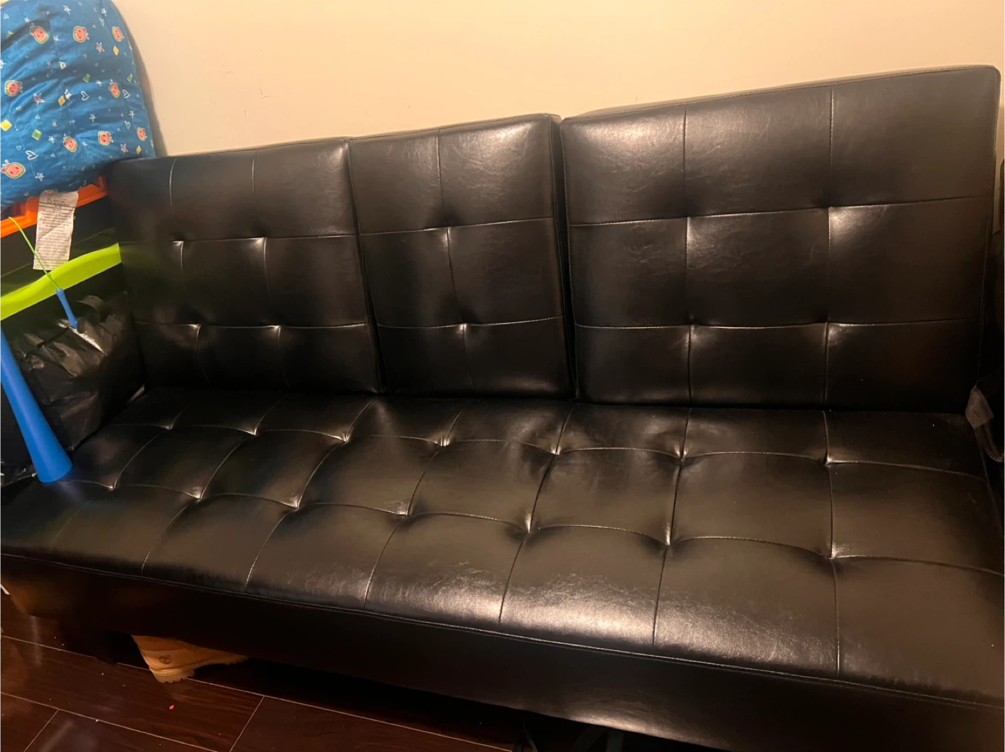 Selling a black faux leather sofa bed. It's brand new, open box and would be great for a living room or spare room. The sofa easily converts into a bed, making it perfect for guests. It has a modern look with a tufted design