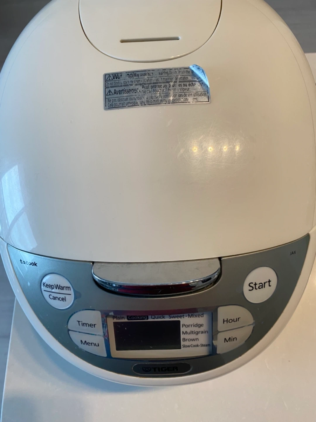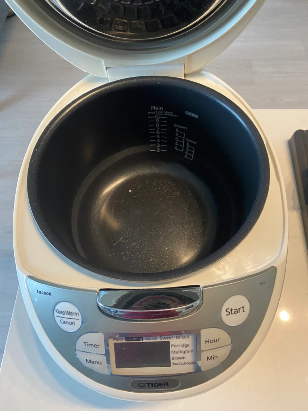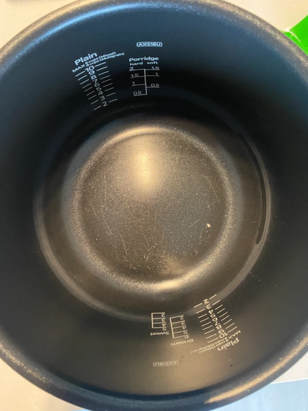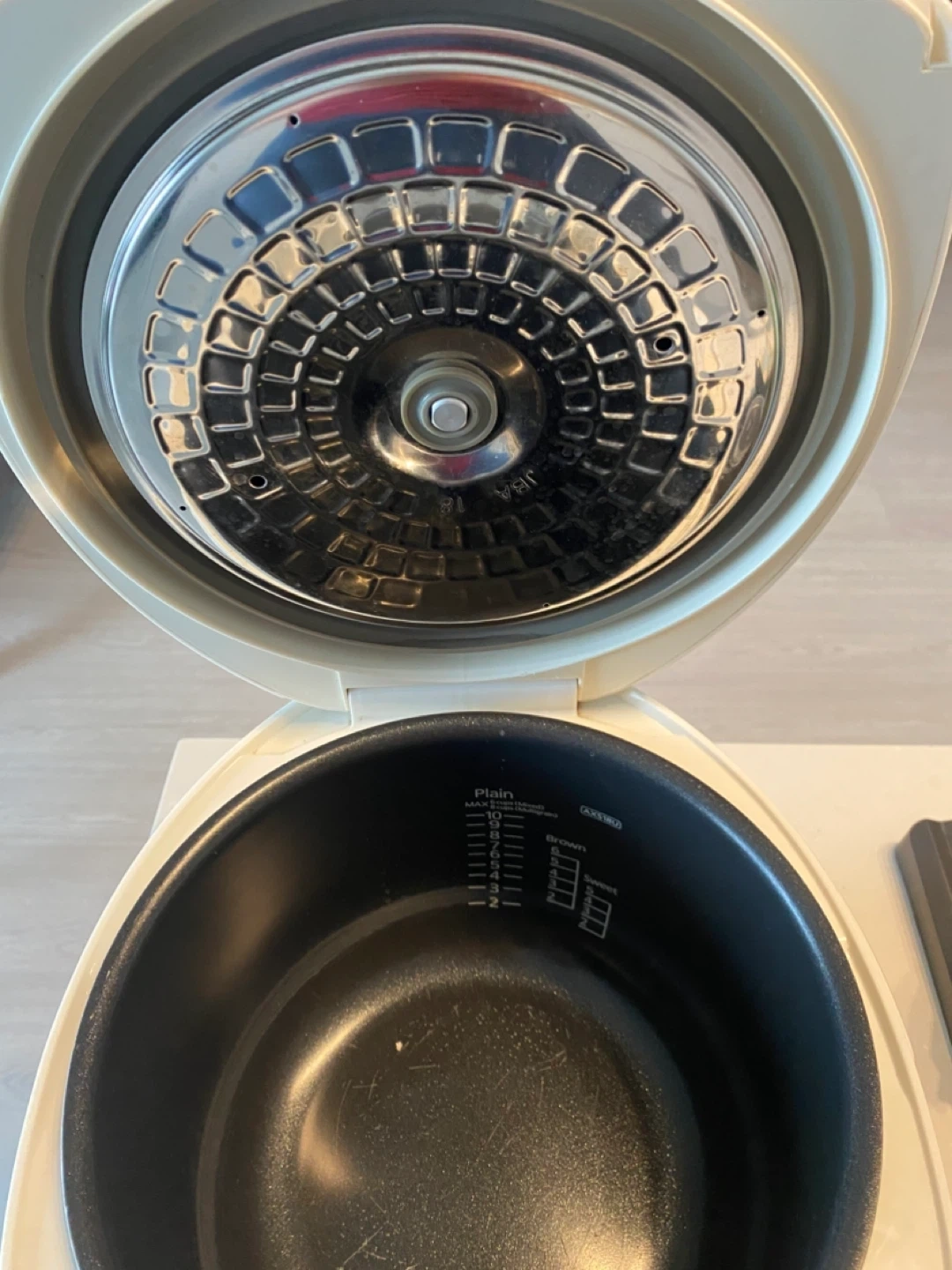 It has some signs of use on the inside of the pot, but is still in good working condition. Perfect for cooking plain rice, porridge, multigrain, and more!