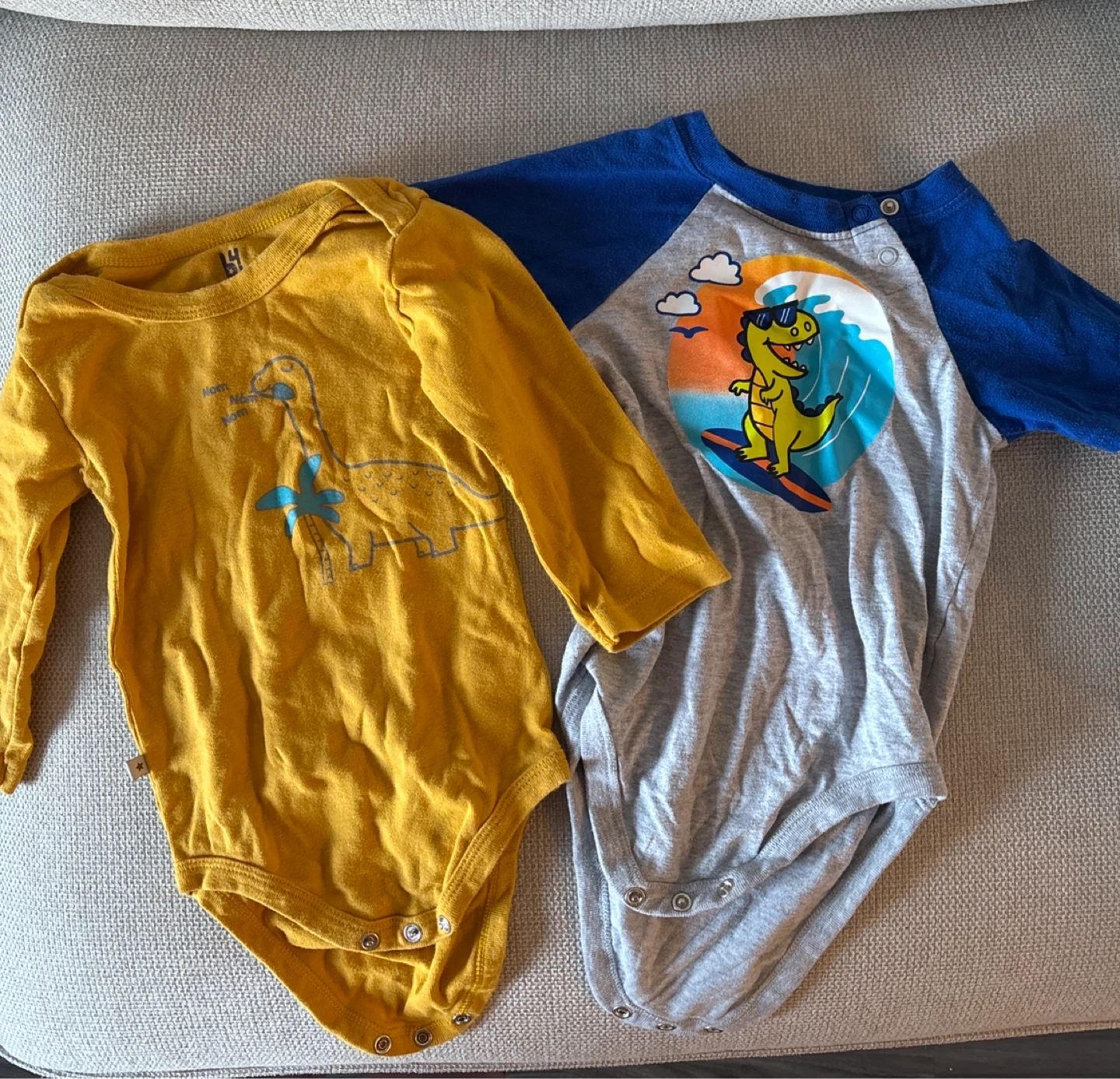 Selling two baby long sleeve bodysuits! One is yellow with a dinosaur print, and the other is grey and blue with a surfing dinosaur design. Both are in great condition and ready for your little one!
