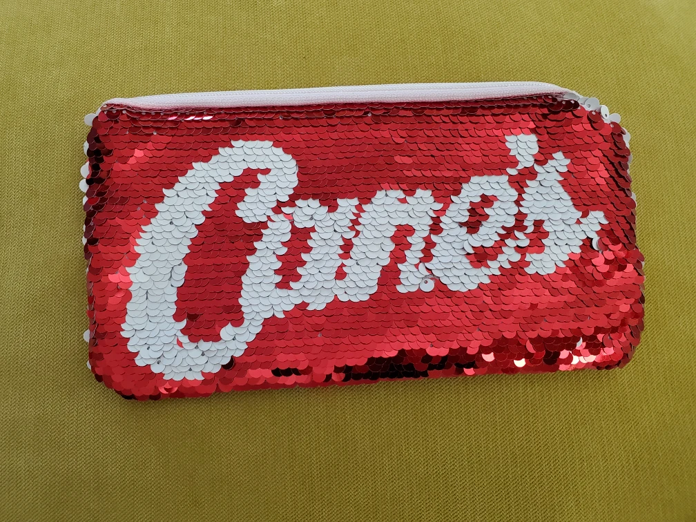 Here's a fun red sequin from Raising Cane's! It's perfect for carrying your makeup or other small items. The sequins add a touch of sparkle and make it stand out.