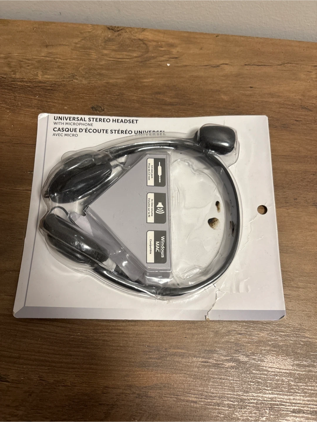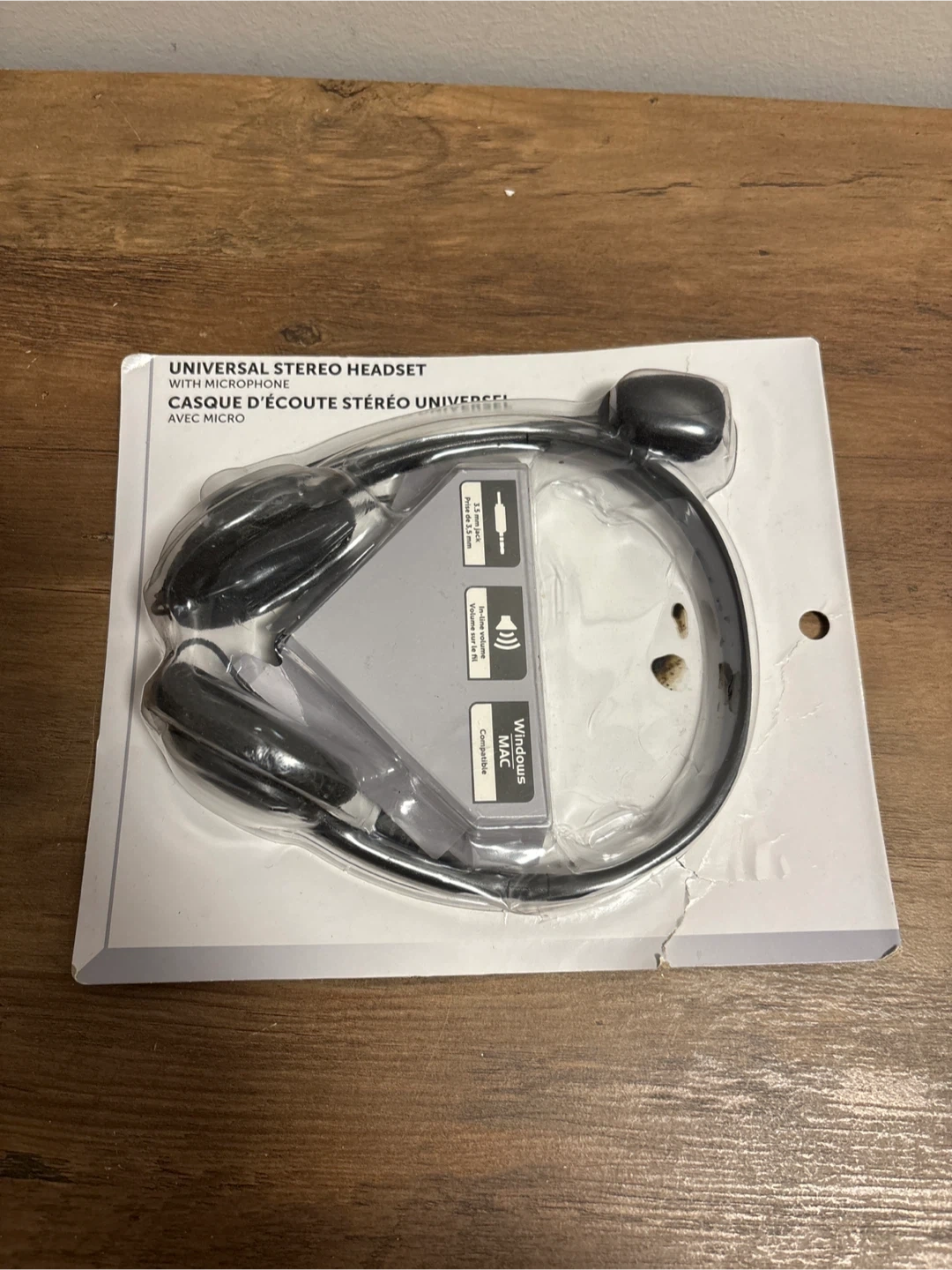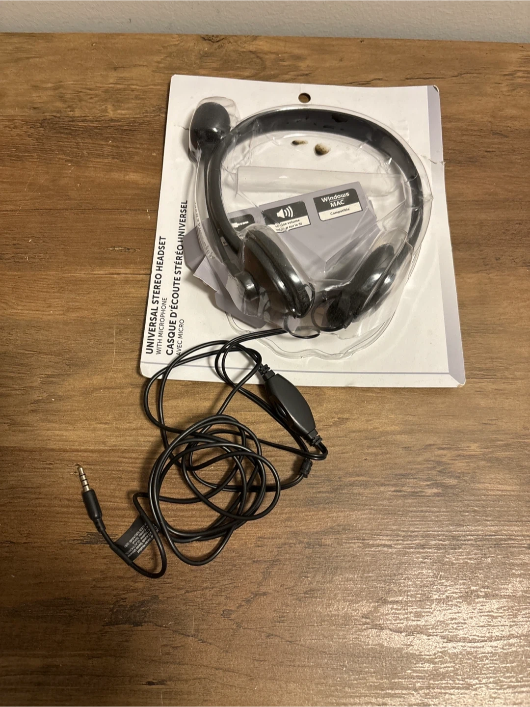 Selling a universal stereo headset with a microphone! It's still in its original packaging. This headset features an adjustable headband, boom microphone, and ultra-soft foam ear cushions. It also has in-line volume control and a single 3.5 mm plug for both audio and microphone. Compatible with Windows and Mac, and works with older and newer computers with a 3.5 mm jack