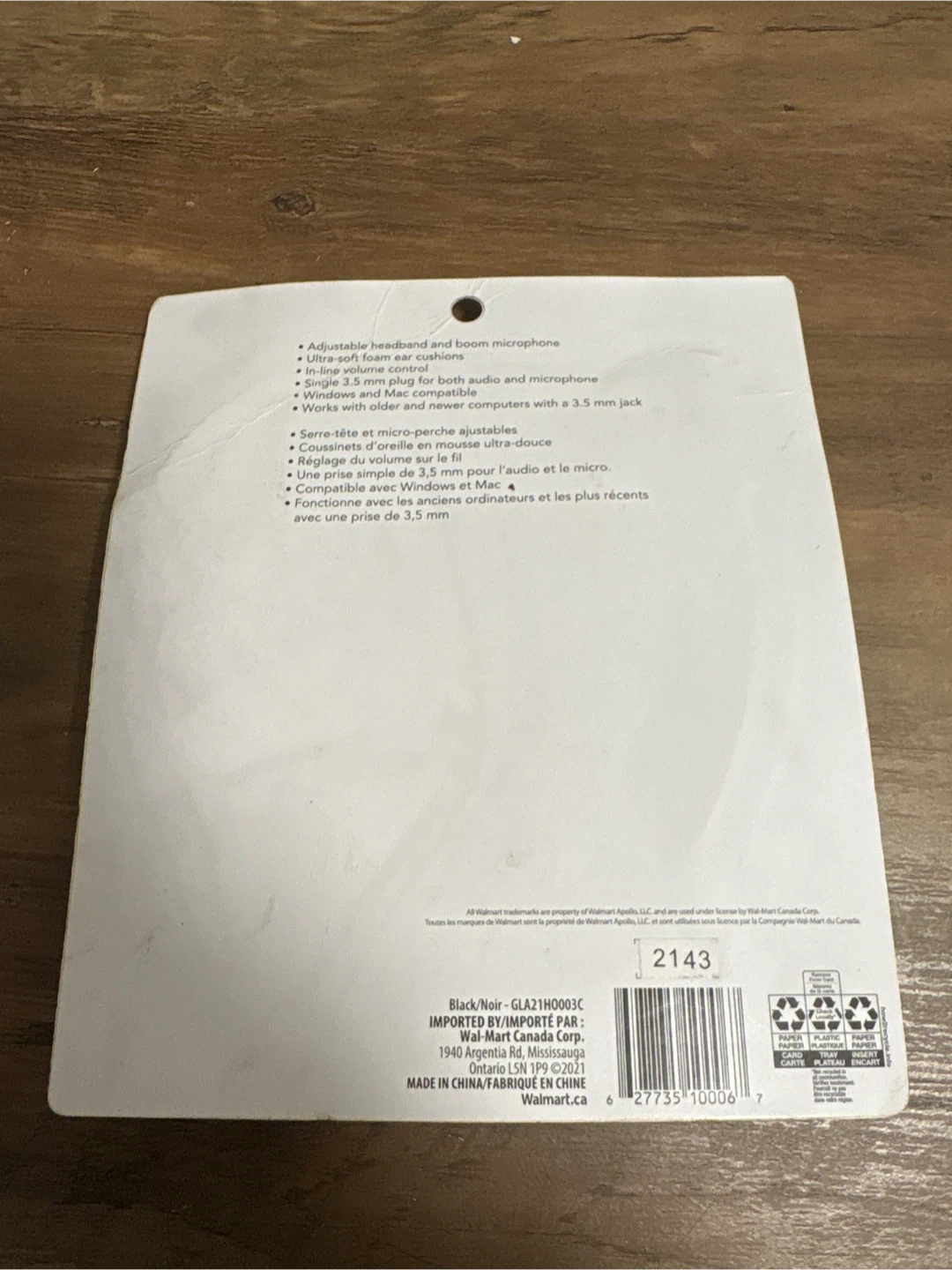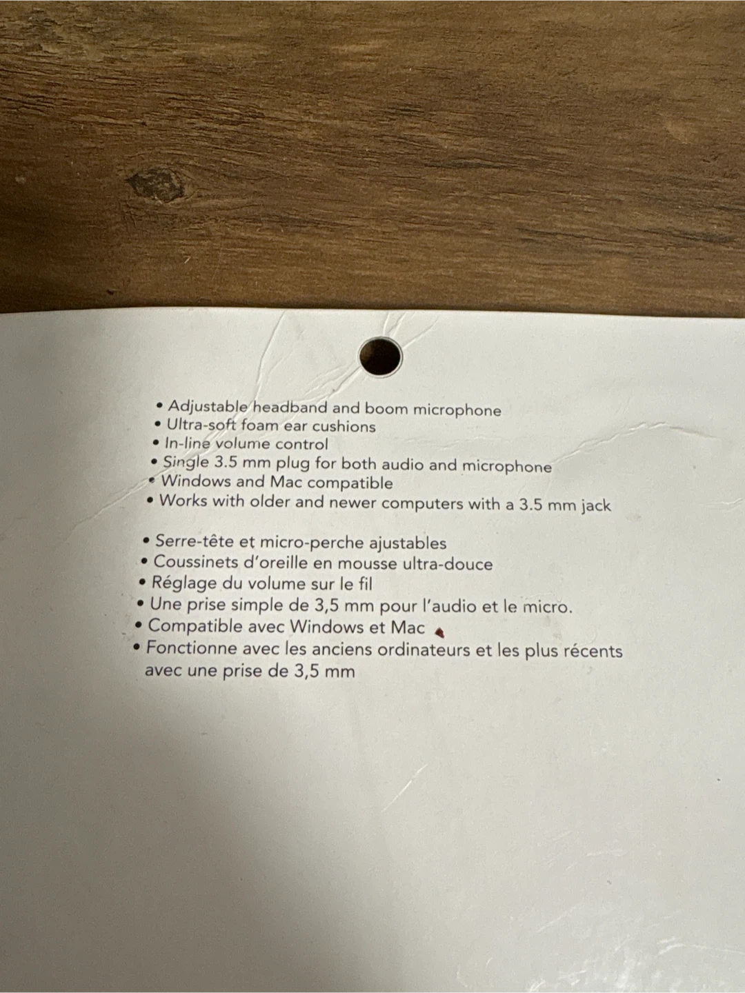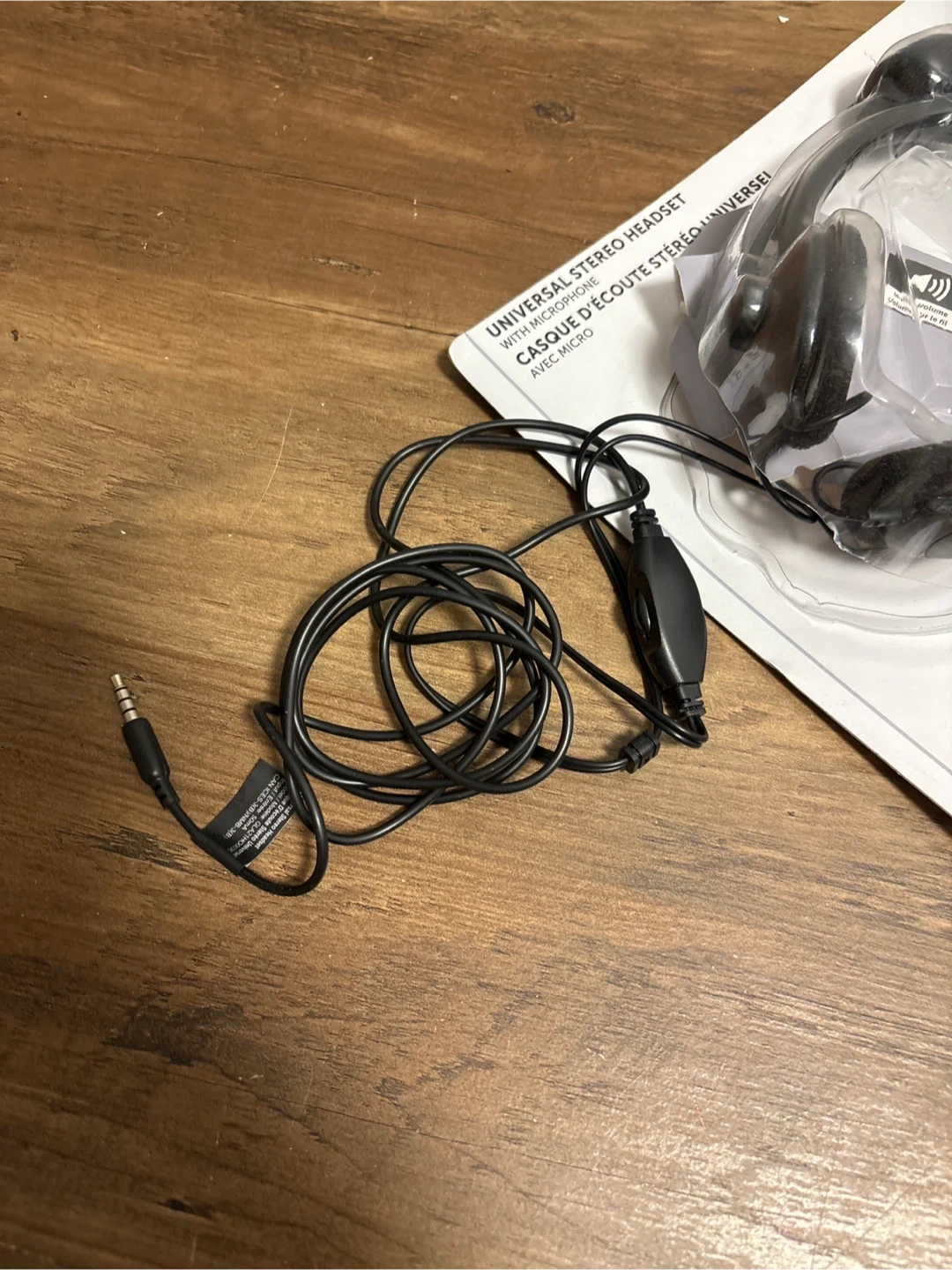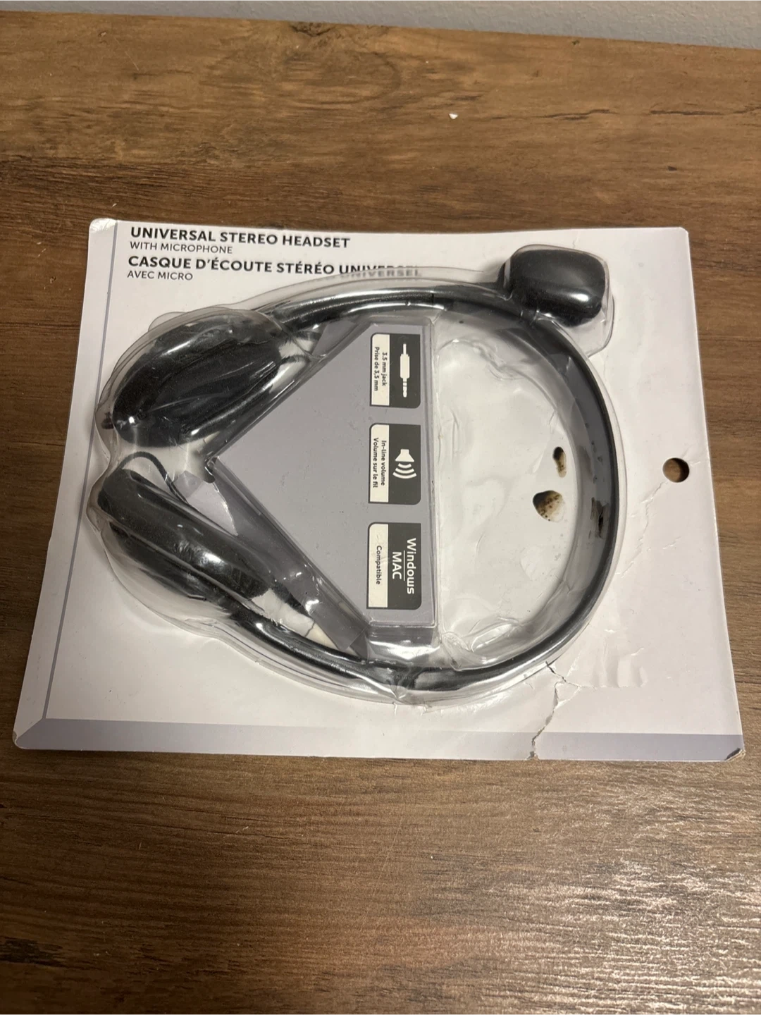 Selling a universal stereo headset with a microphone! It's still in its original packaging. This headset features an adjustable headband, boom microphone, and ultra-soft foam ear cushions. It also has in-line volume control and a single 3.5 mm plug for both audio and microphone. Compatible with Windows and Mac, and works with older and newer computers with a 3.5 mm jack