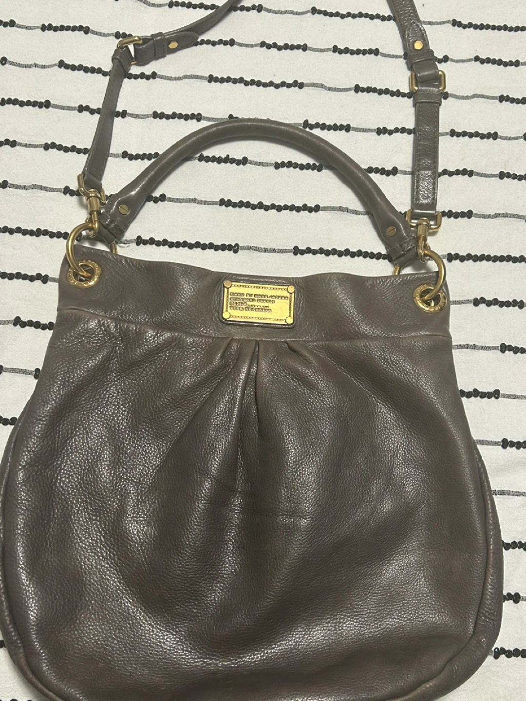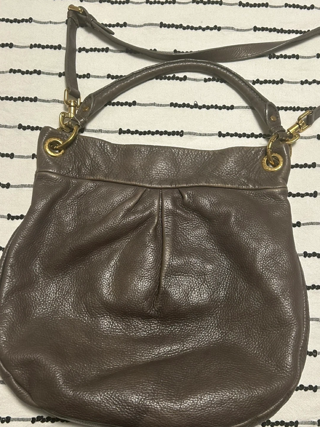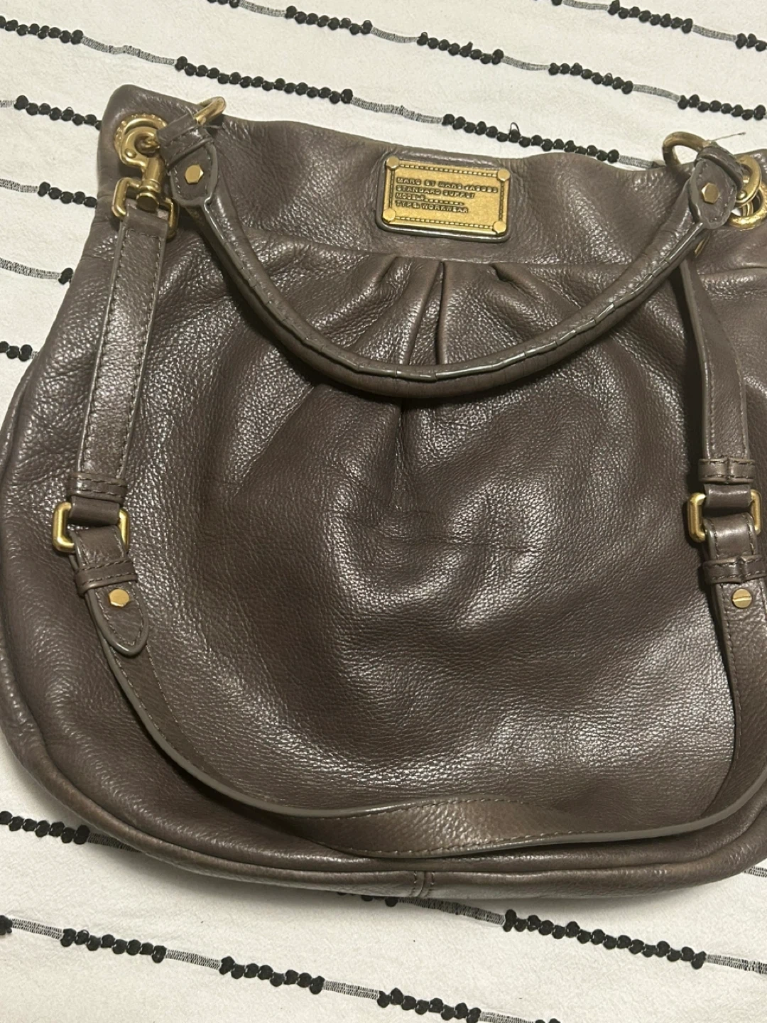 Here's a lovely Marc Jacobs leather shoulder bag! It's a stylish and practical bag for everyday use. The leather has a nice texture and the gold hardware adds a touch of elegance. It's in good condition and ready for a new owner! 37 cm wide x 32 cm long. open to reasonable offers. I invite you to view my other items; if you are interested in any of them, I will give you a better price.