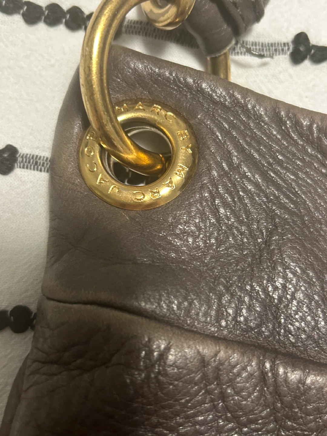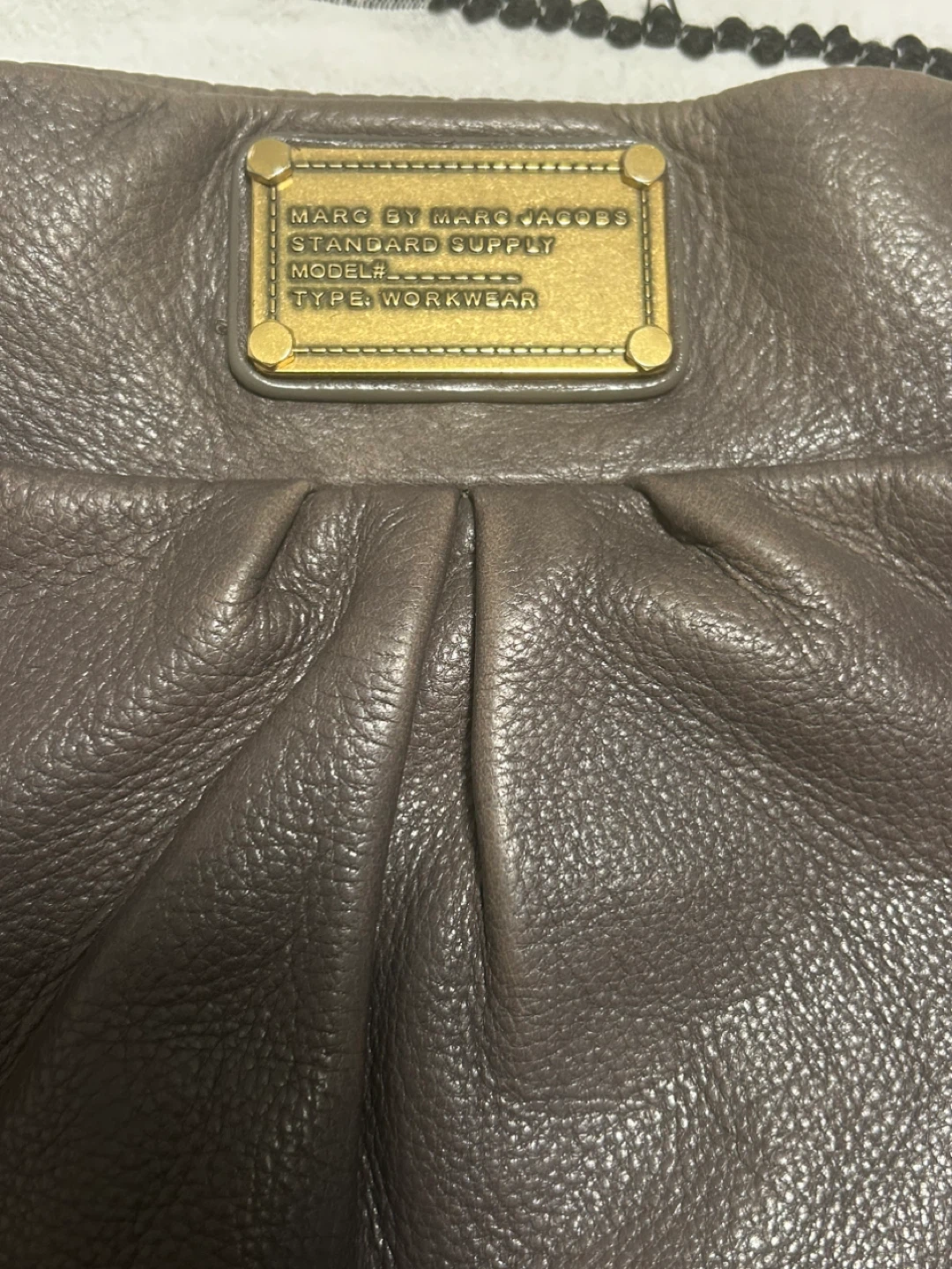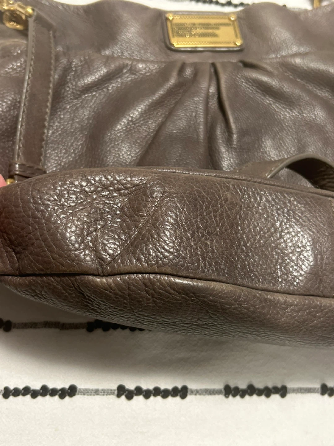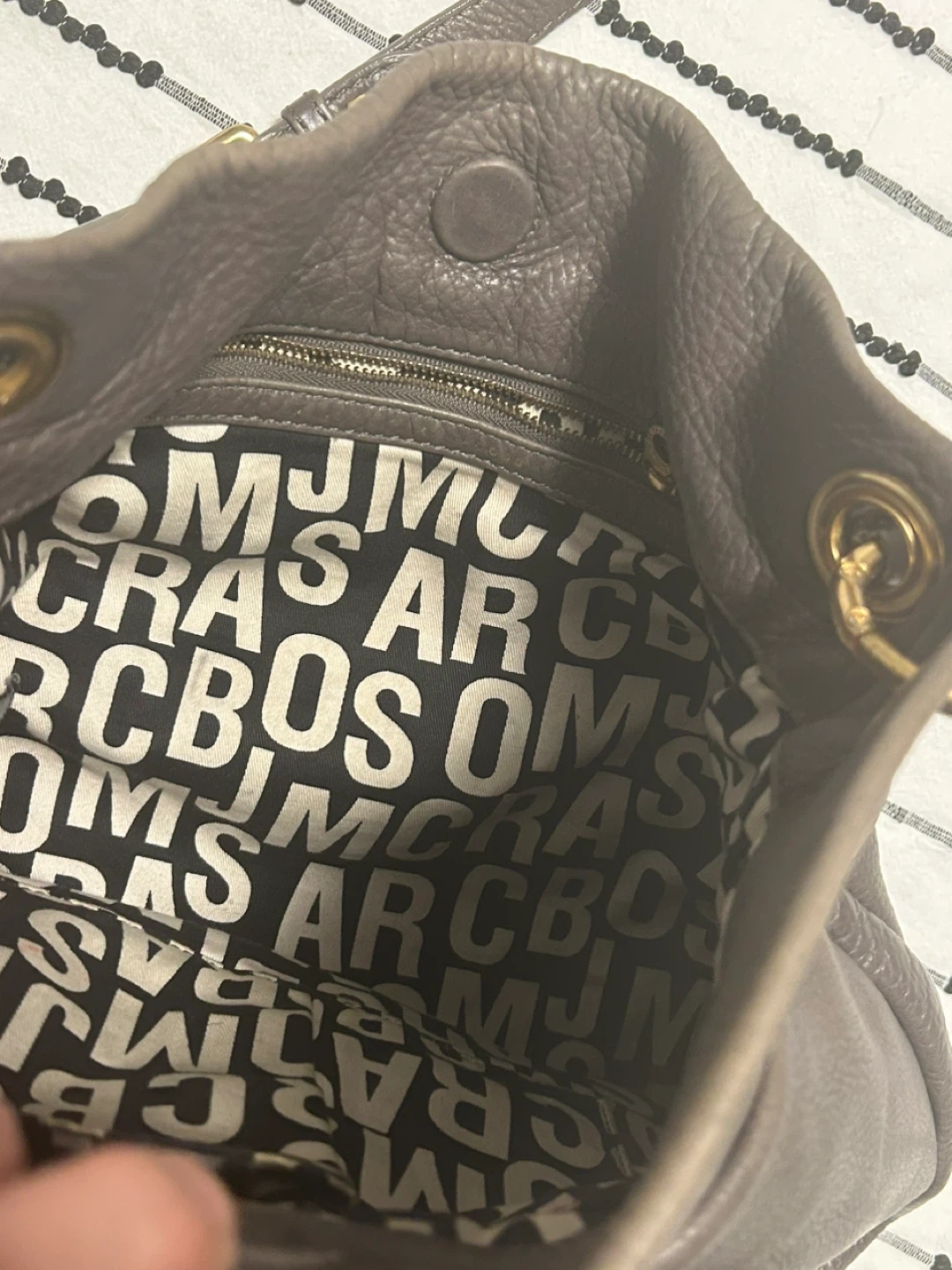 Here's a lovely Marc Jacobs leather shoulder bag! It's a stylish and practical bag for everyday use. The leather has a nice texture and the gold hardware adds a touch of elegance. It's in good condition and ready for a new owner! 37 cm wide x 32 cm long. open to reasonable offers. I invite you to view my other items; if you are interested in any of them, I will give you a better price.