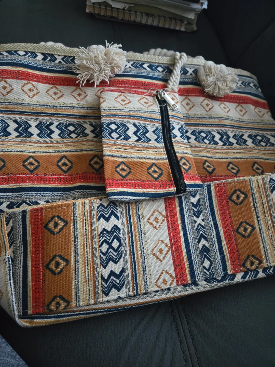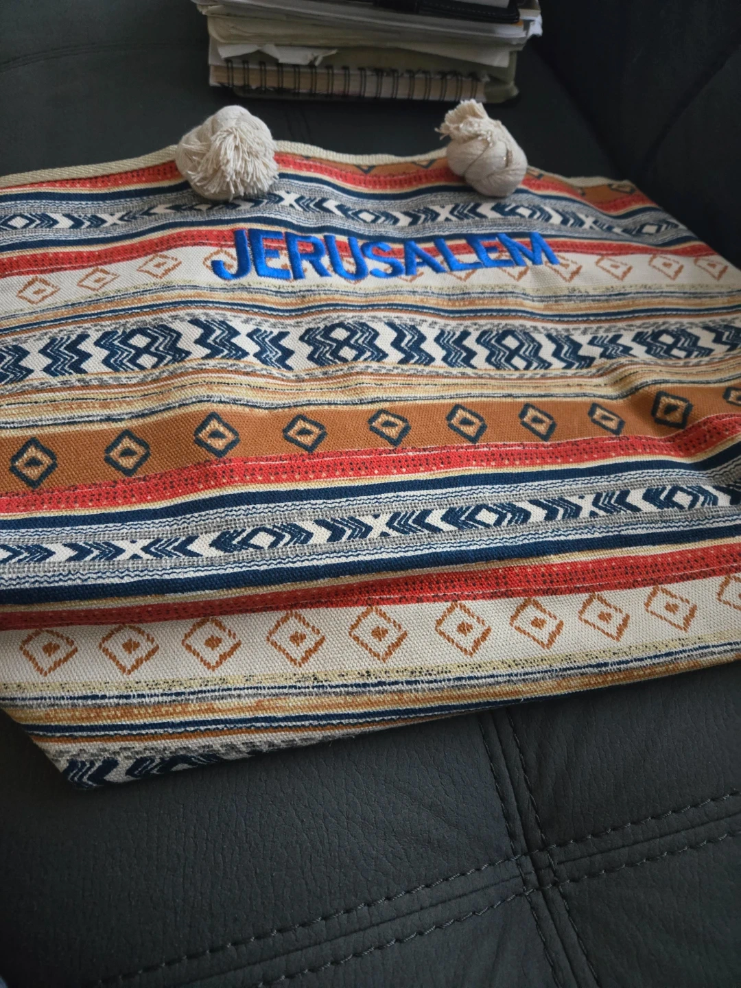 This is a tote bag purchased in Jerusalem. It has a colourful design with tassels and a small zippered pouch on the front. Perfect for carrying your essentials in style!