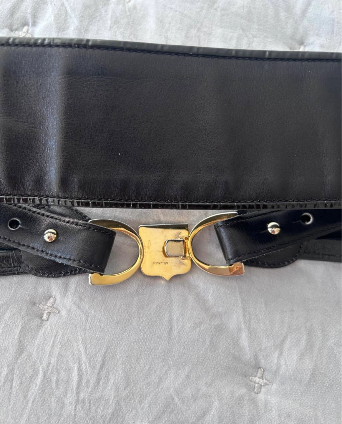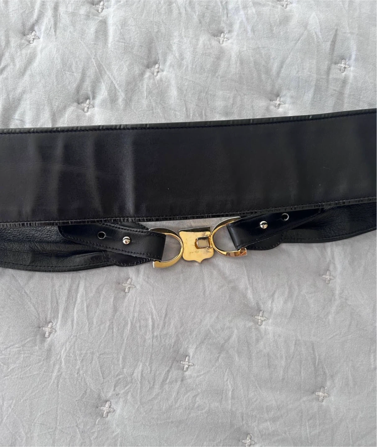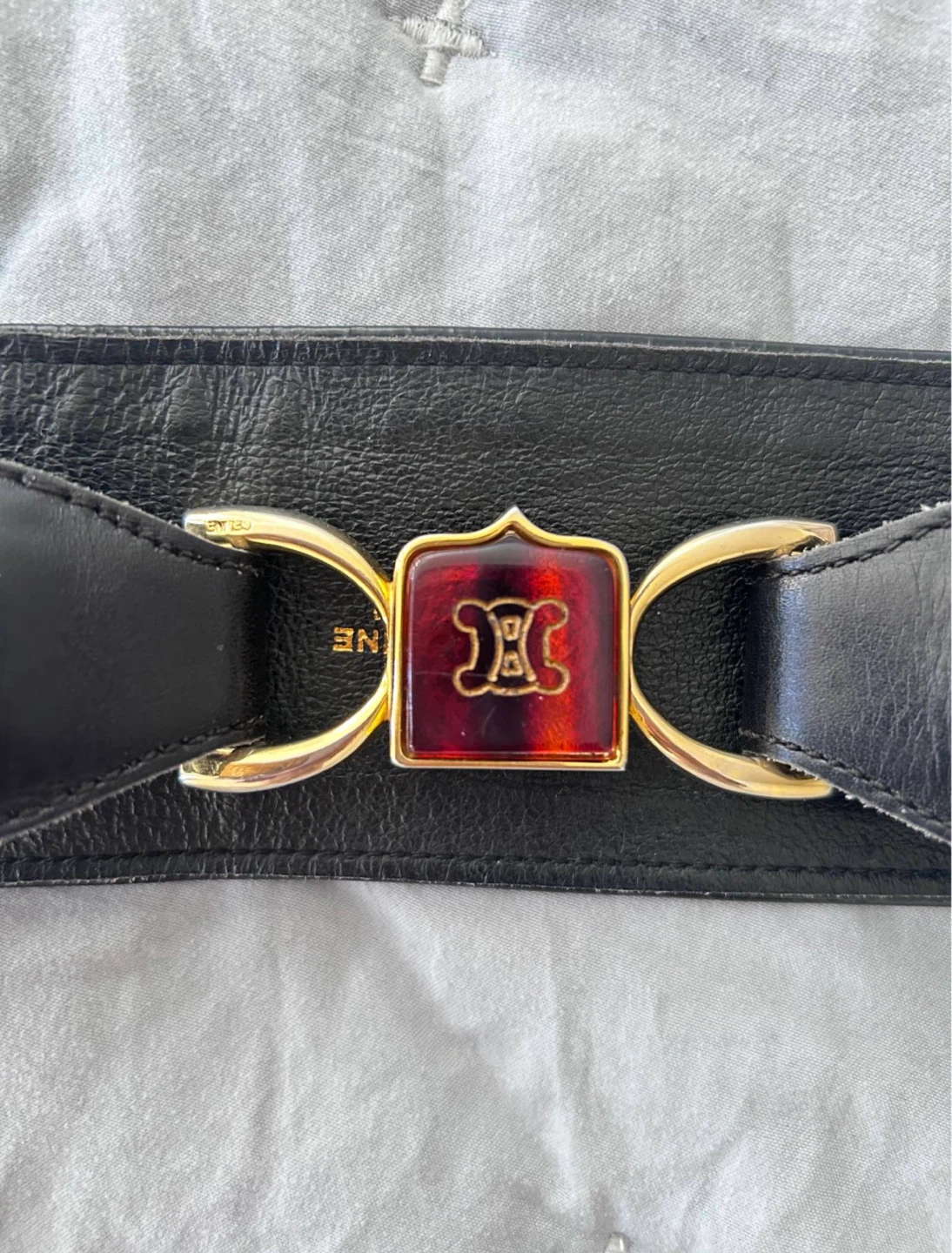 Selling a stylish Celine black leather belt. It features a unique buckle design with gold-tone hardware and a distinctive logo. This belt is a fashionable accessory to elevate any outfit!
