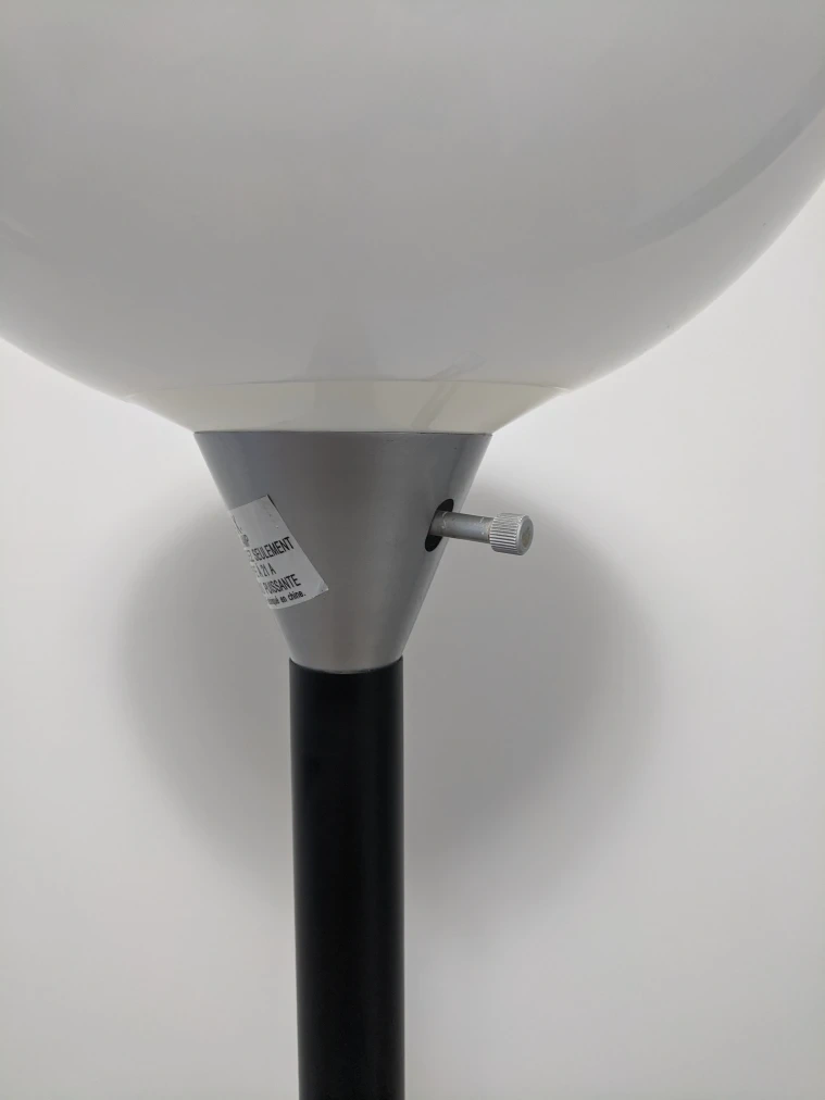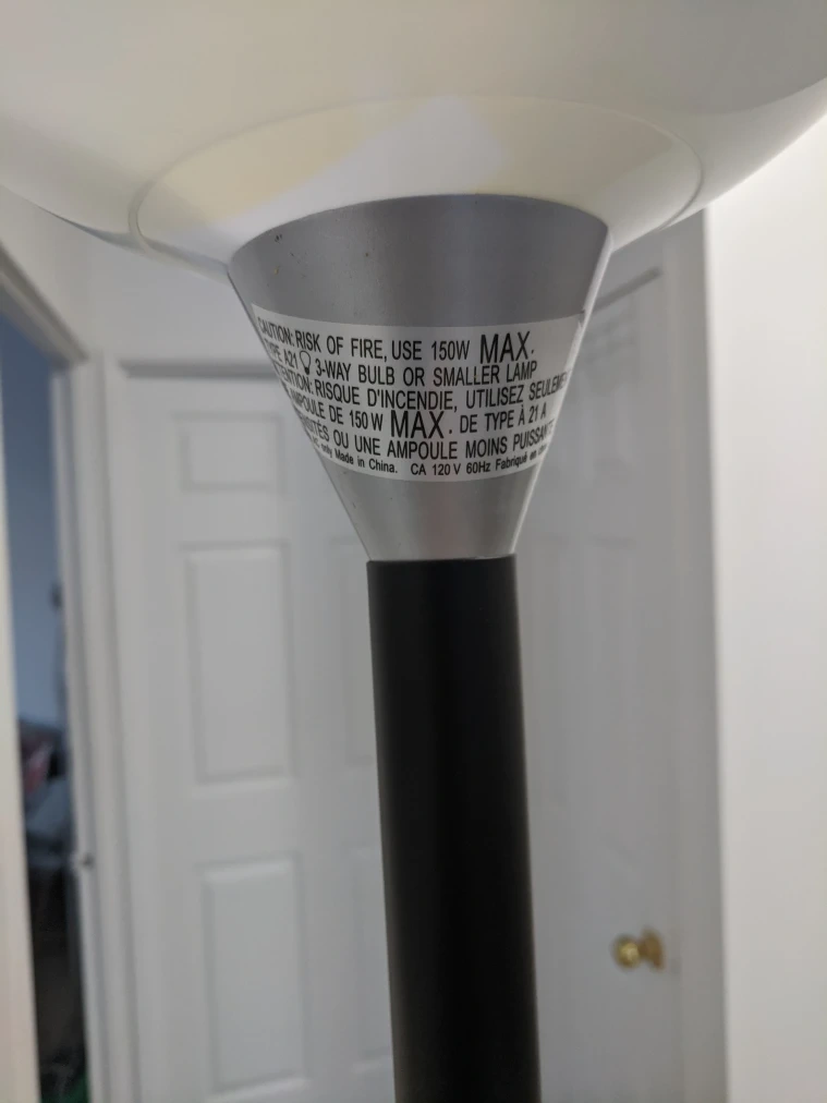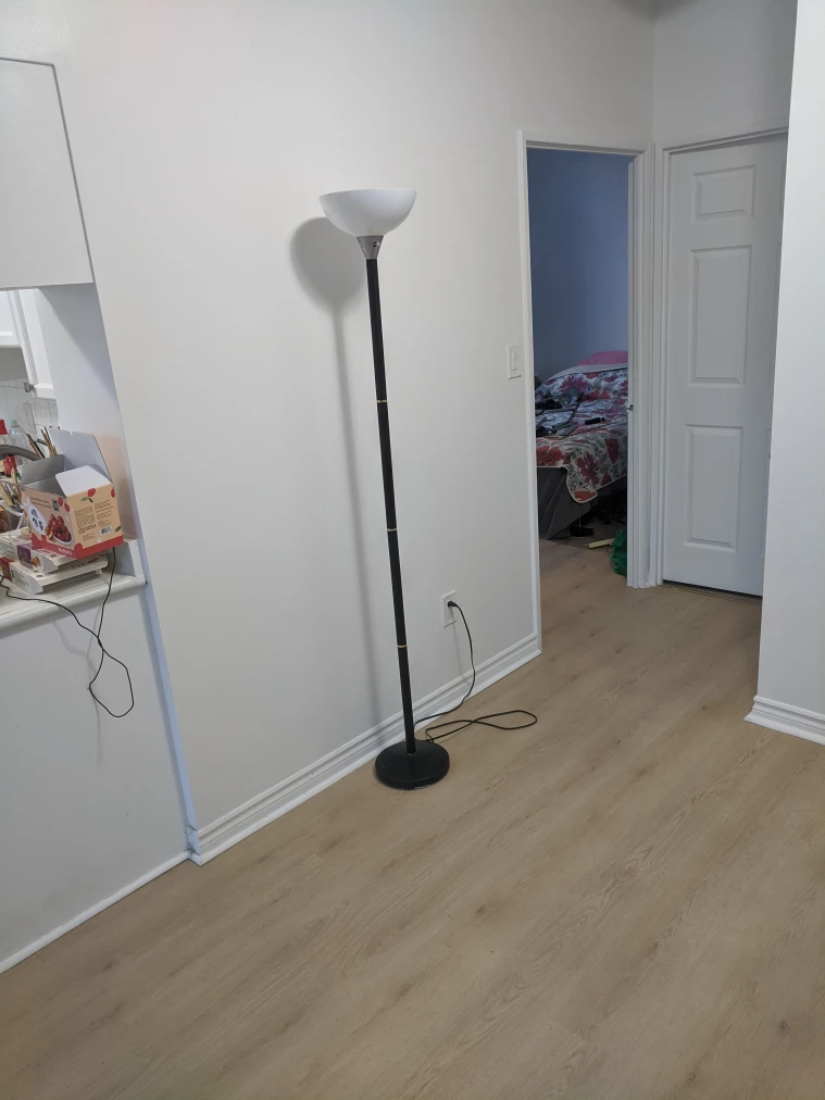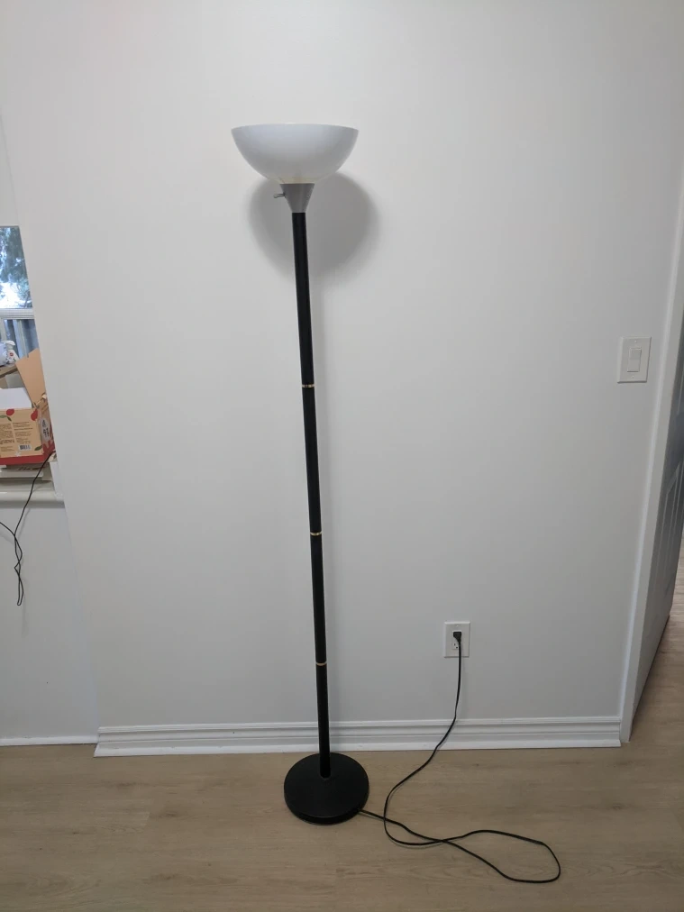 Selling a standing floor lamp with a black base and pole, topped with a white shade. It uses a up to 150W max. Perfect for adding some extra light to any room! Height is 72.5". Pretty heavy.
