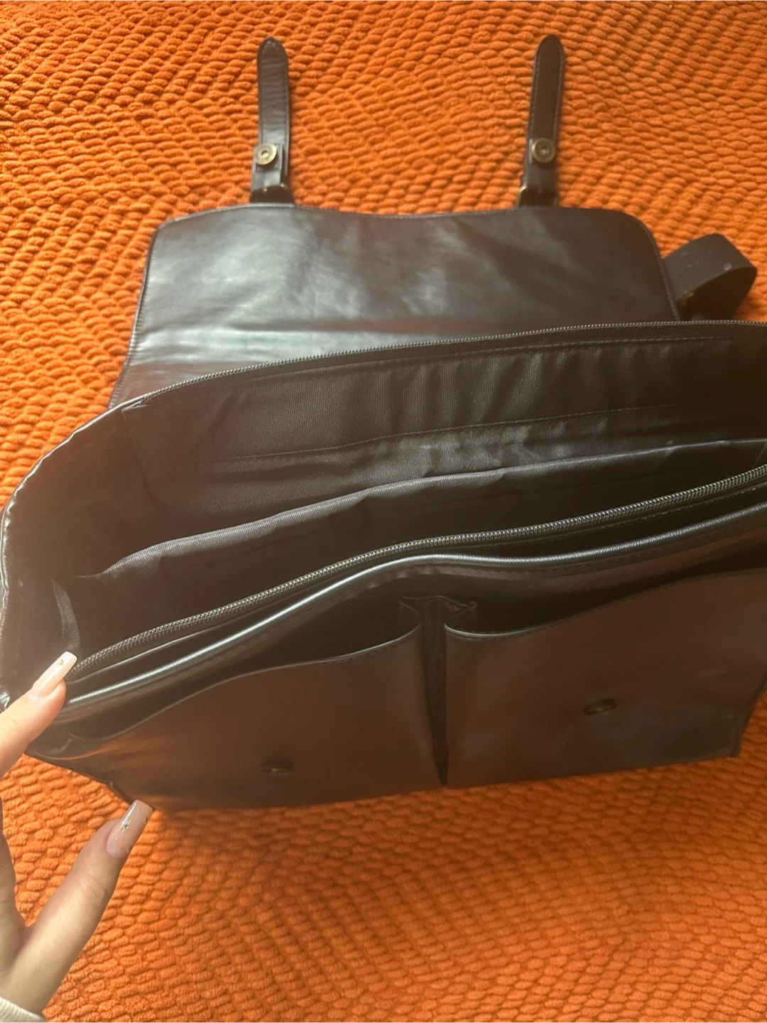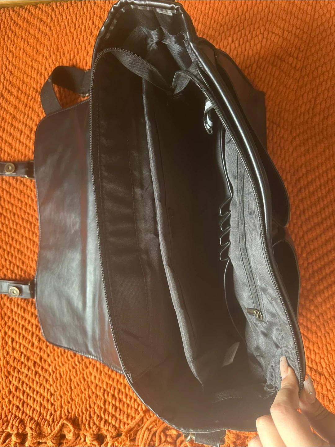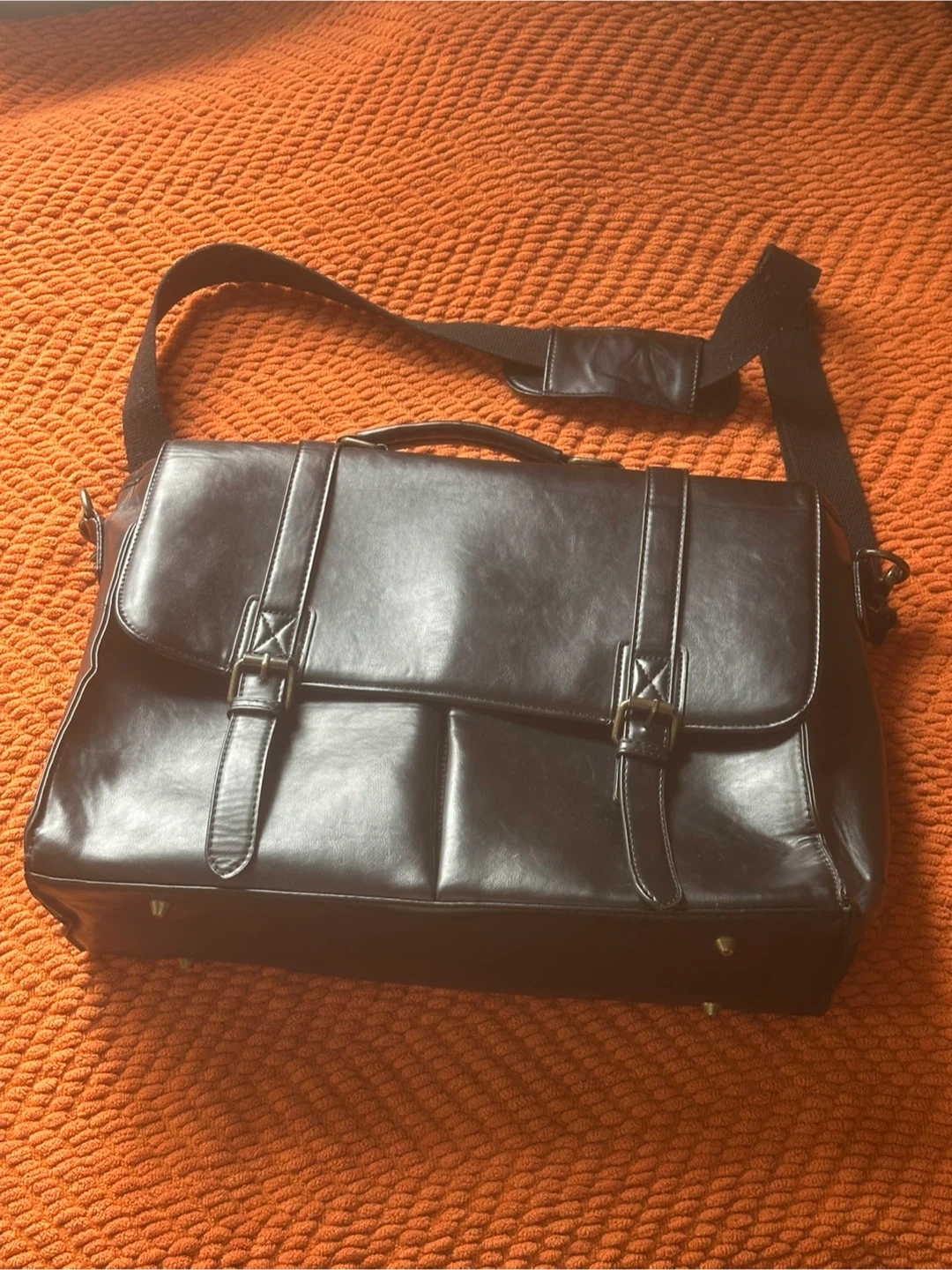 Selling a black leather messenger bag. It has a classic design with multiple compartments for organizing your belongings. Great for work or school!