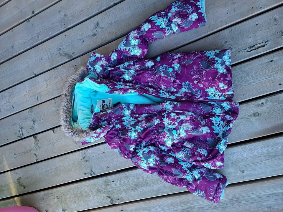 Size 10, purple and teal floral jacket with matching grey snowpants. Detachable hood.