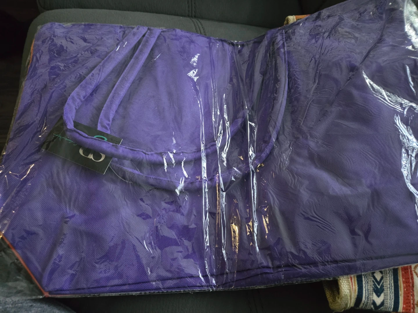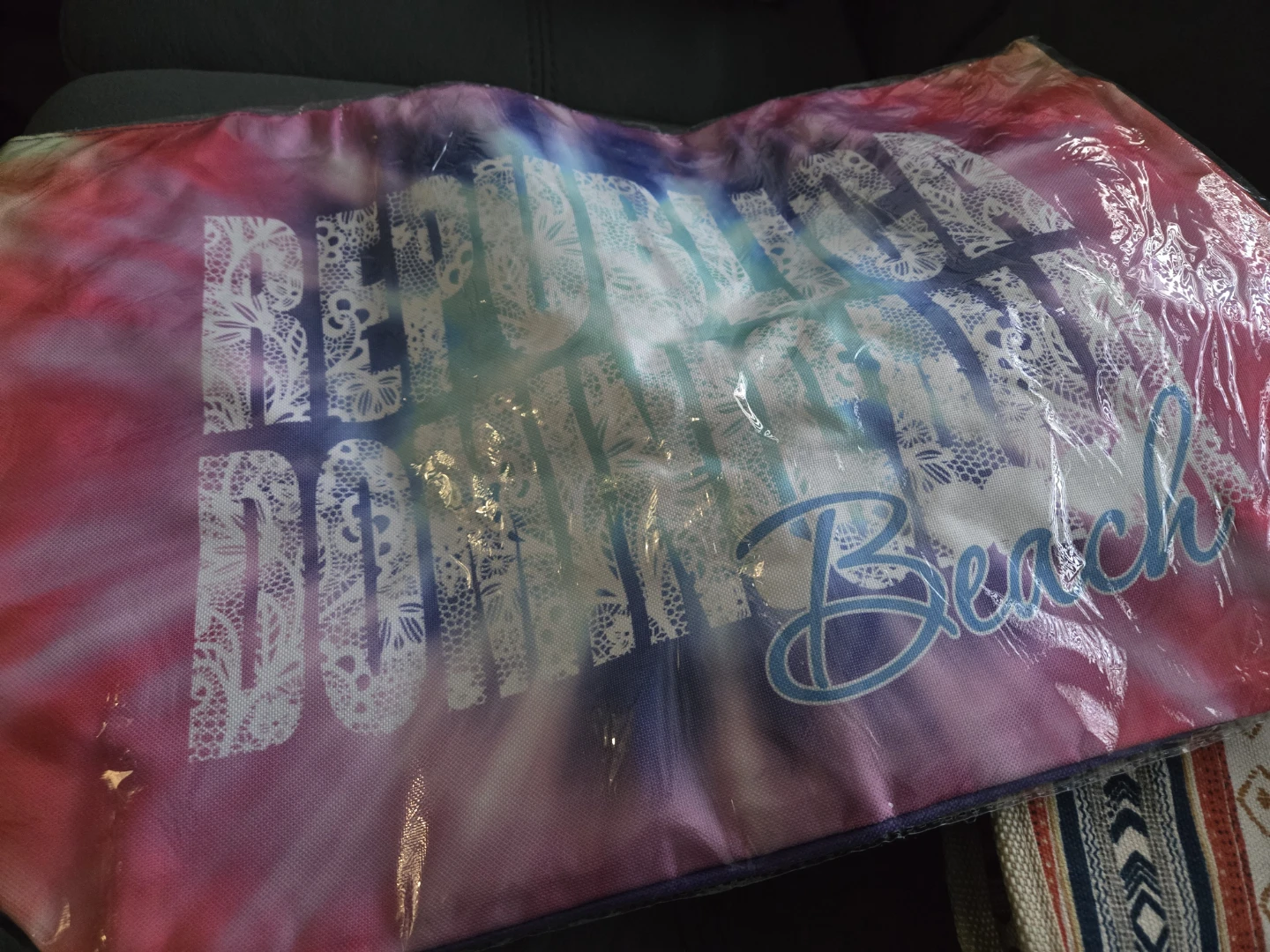 This is a brand new souvinaire beach tote bag still in its original packaging! It's a vibrant purple colour on one side, and a fun tie-dye pattern 'Dominican Republic Beach' . Perfect for carrying all your essentials to the beach or pool