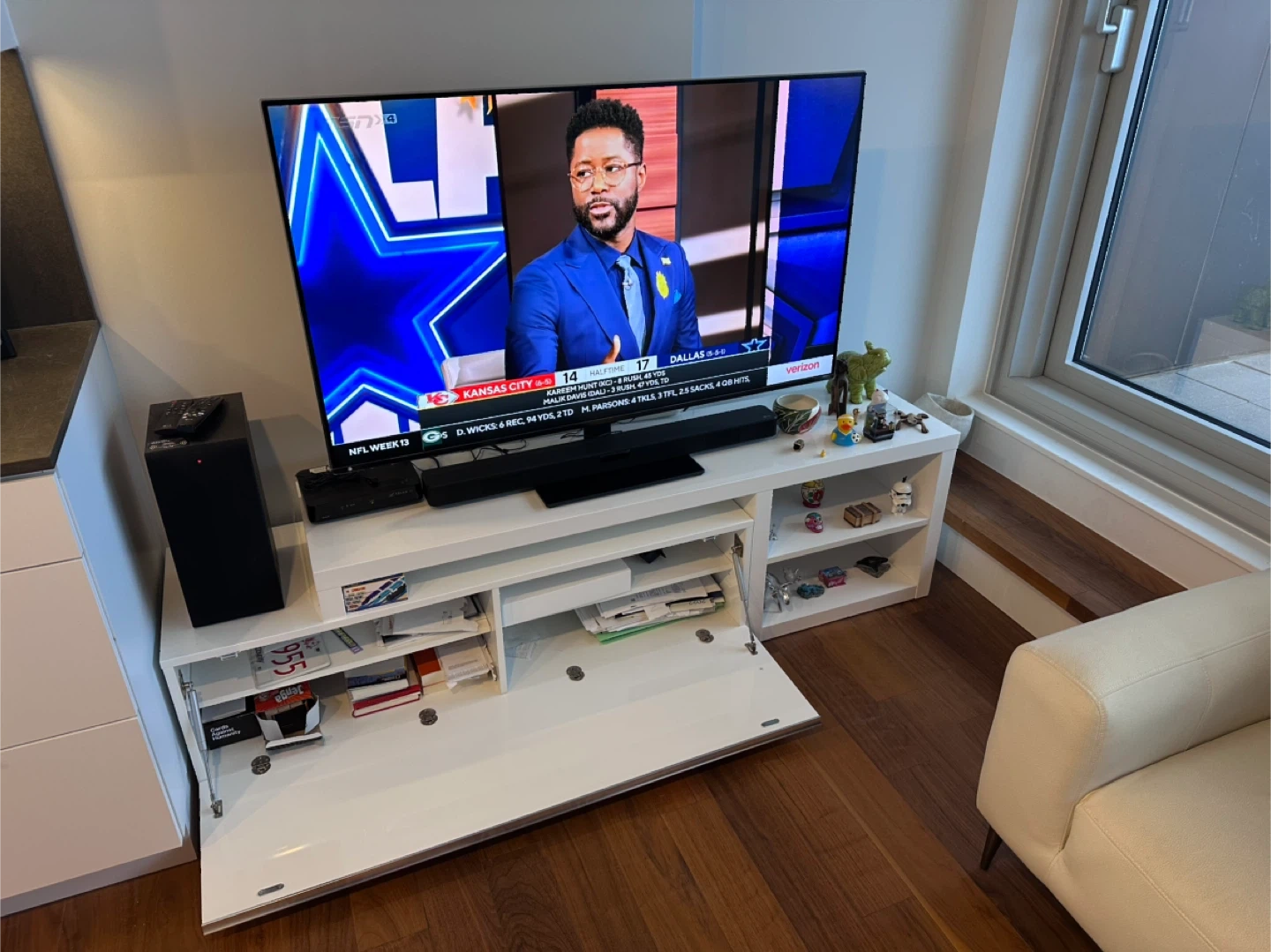 Clean, modern white TV stand with low-profile design. Features both open shelving (for devices) and closed storage (for clutter). Great for a modern living space. 1.92m by 51m tv stand