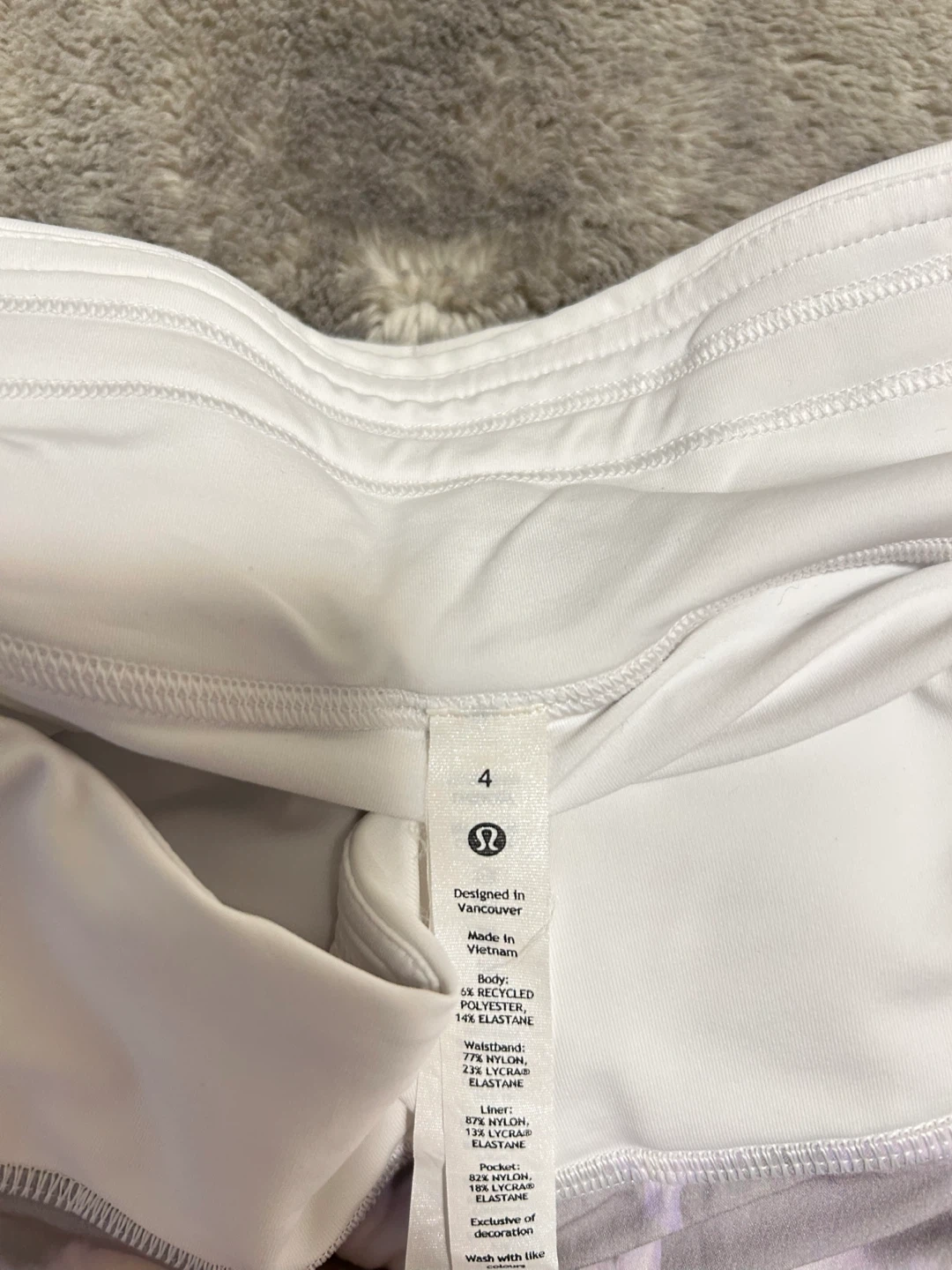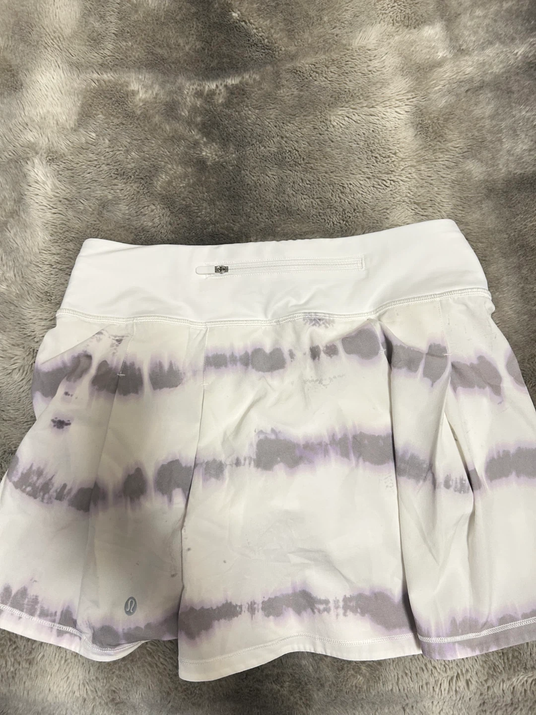 Selling a Lululemon skirt in a size 4! It's a white skirt with a light purple tie-dye pattern. Made in Vietnam with: