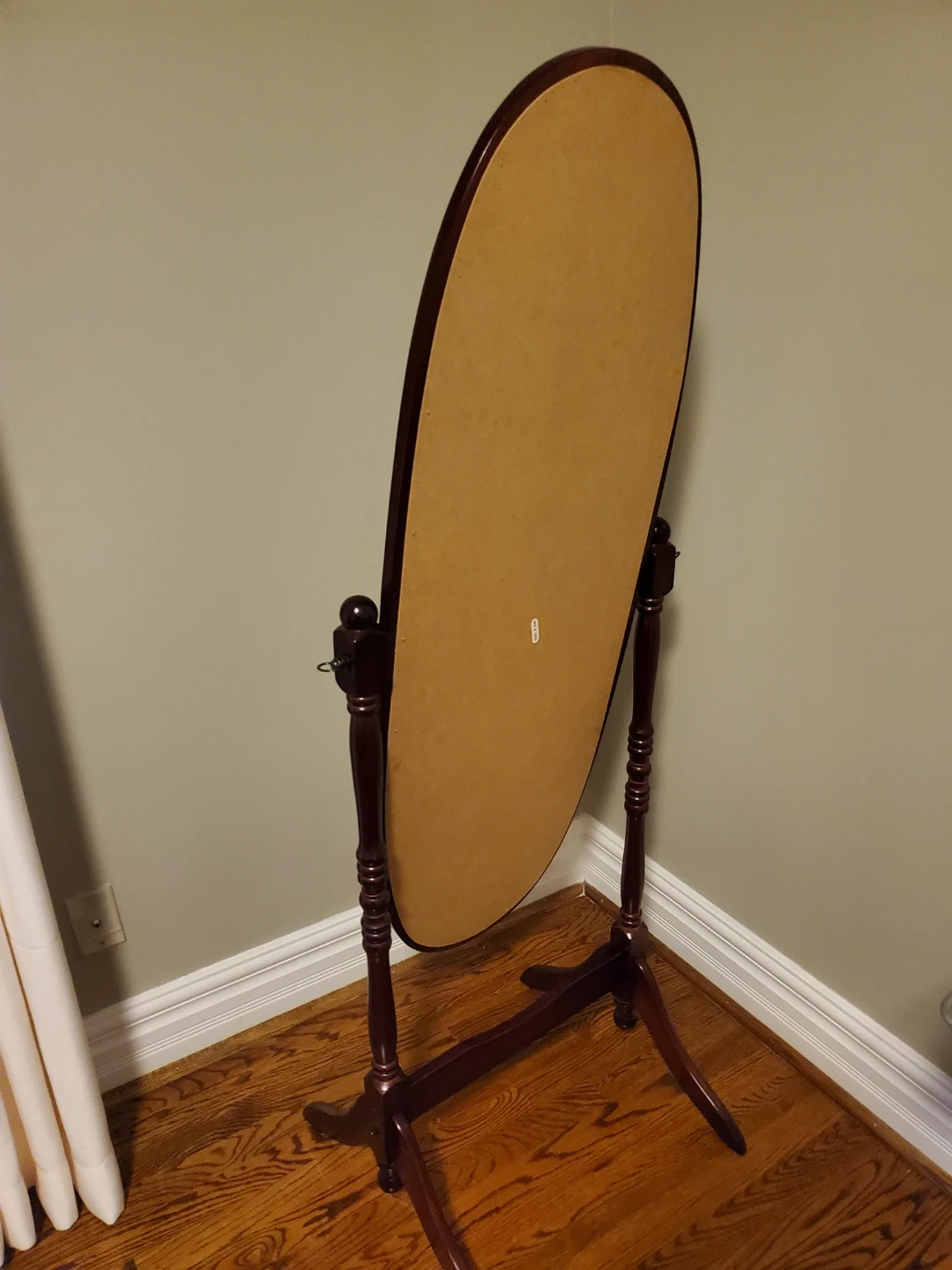 Here's a lovely oval cheval mirror with a dark wood finish! It's in great shape and would look fantastic in any bedroom or dressing area. The mirror is supported by a sturdy stand, allowing you to easily adjust the viewing angle. It's a great addition to any home!