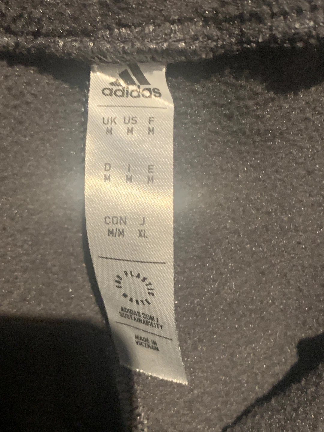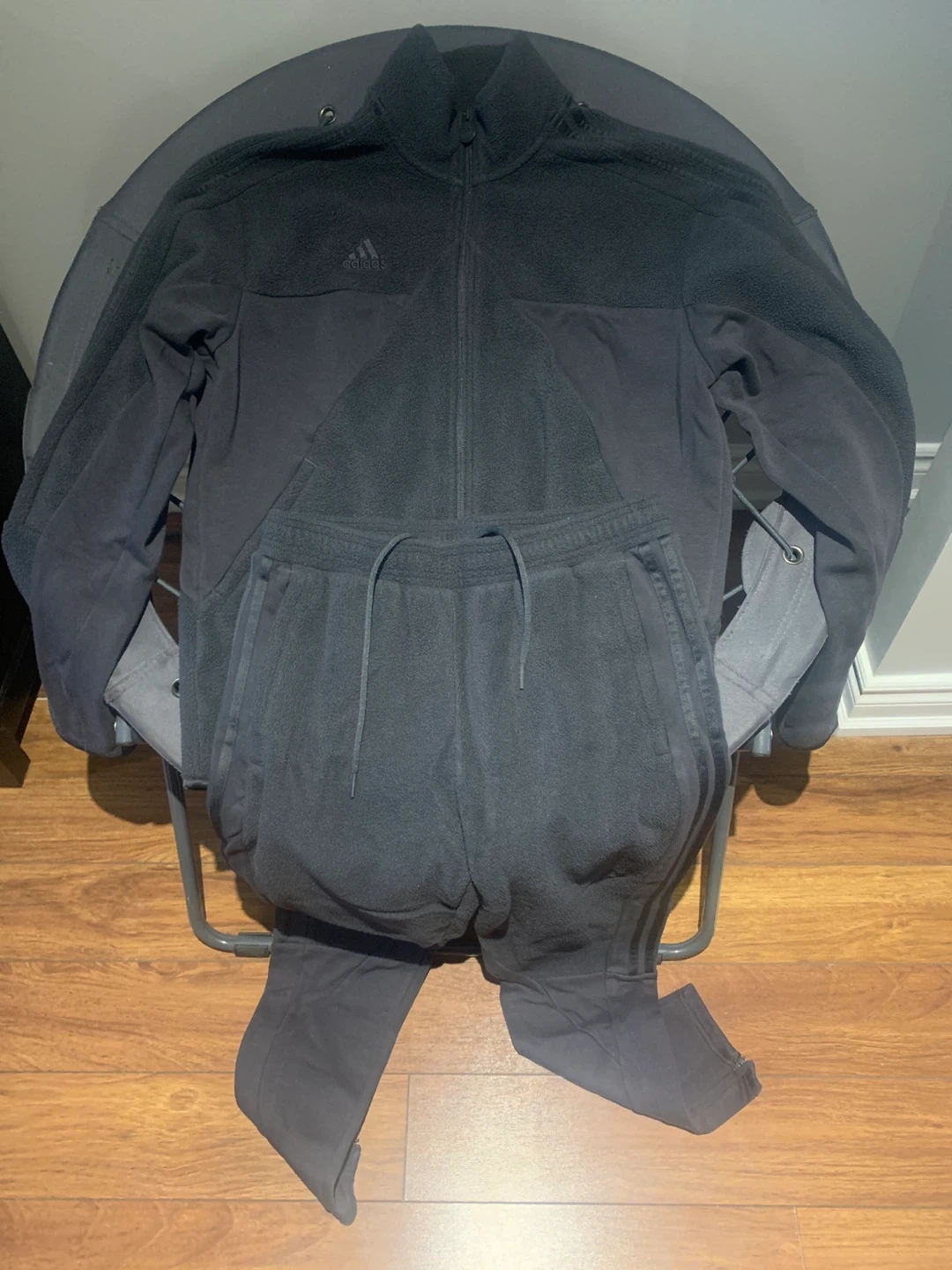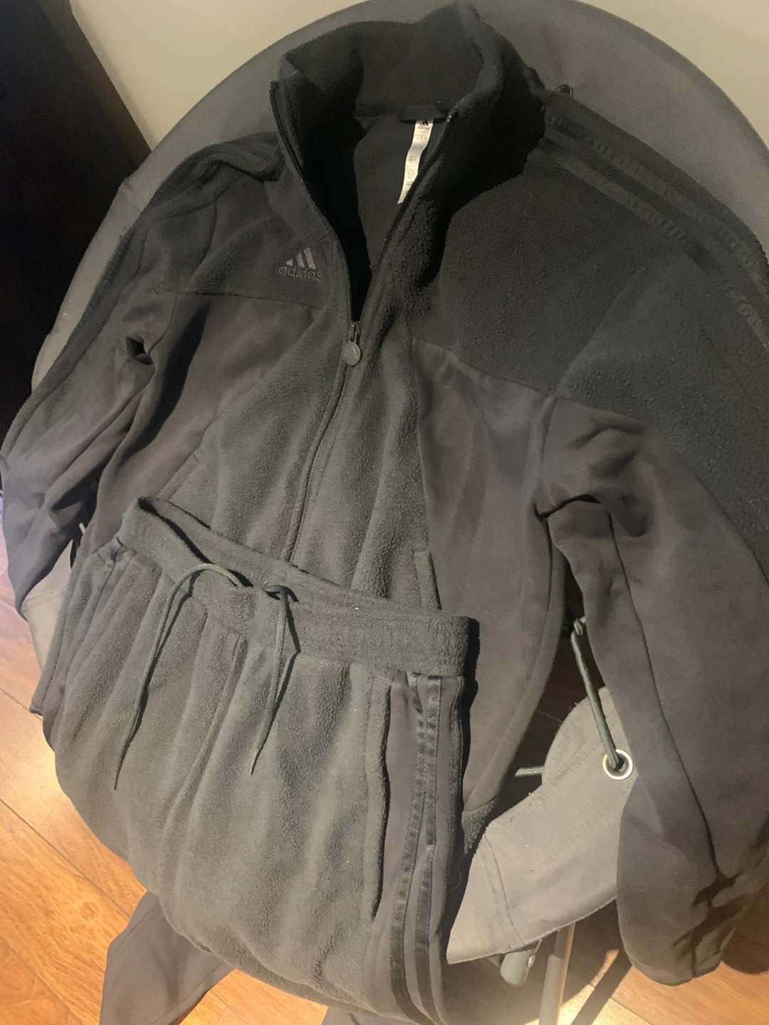 Selling a comfy Adidas Teddy Fleece tracksuit in black. The size is M/M (Medium/Medium). Perfect for lounging or working out!